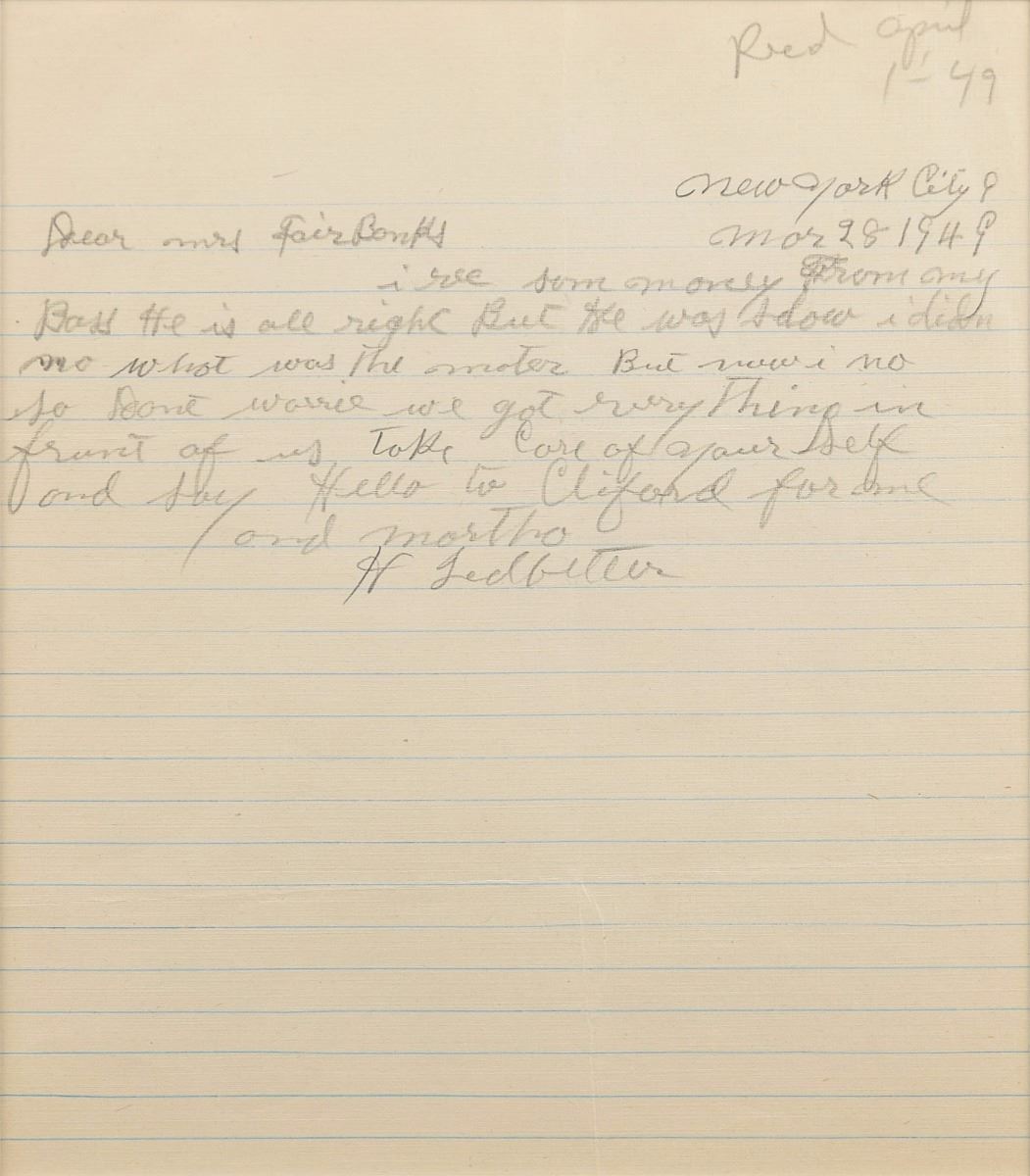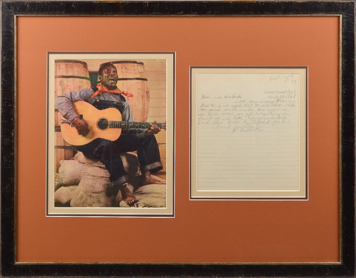ALS in pencil, signed “H. Ledbetter,” one lightly lined page, 7.5 x 8.75, March 28, 1949. Letter to his manager, Marjorie Fairbanks, in full (spelling and grammar retained): "I've som money from my Bass He is all right But He was slow i didn no what was the mater But now i no so Dont worrie we got every thing in front of us Take Care of yourself and say Hello to Clifford for me and martha." Archivally triple-matted and framed with an image of the musician to an overall size of 26.5 x 20.75. In fine condition. Two months after this letter was written, Ledbetter made his first trip to Europe as a part of the International Jazz festival in Paris. However, his time abroad would be cut short due to his deteriorating health and the tragic diagnosis of ALS (Lou Gehrig's Disease). Ledbetter returned to the United States at the end of May 1949, and played only two more shows in his life before passing away in December. Autograph material from Ledbetter is exceedingly scarce.