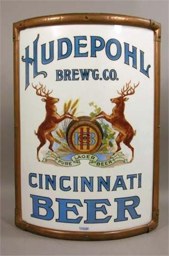 Hudepohl Brewing Co. Vitrolite corner sign, original copper frame, 16" x 22.5" ex. cond.