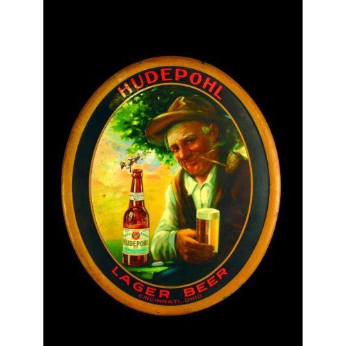 Hudepohl Lager Beer Self-Framed Tin Sign, Cincinnati, OH, some rust above the bottle and paint loss at 11 o'clock otherwise good condition, 14 3/4 x 17 1/4 inches.