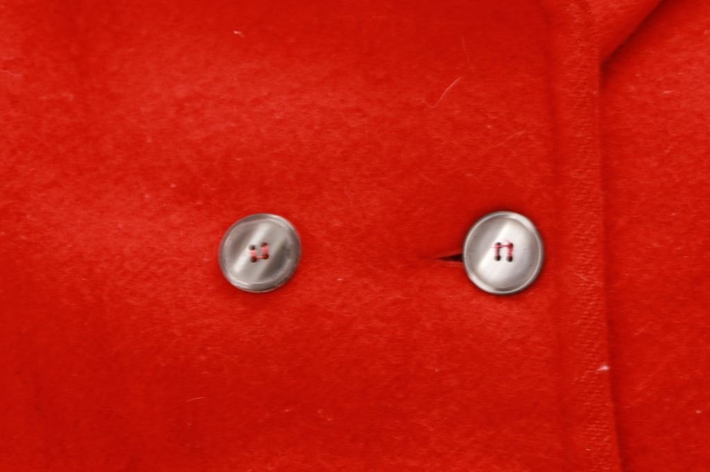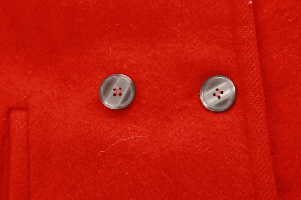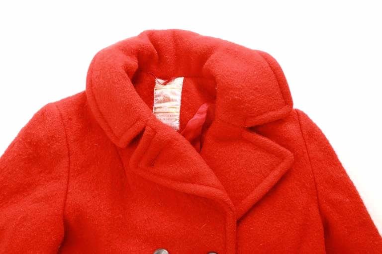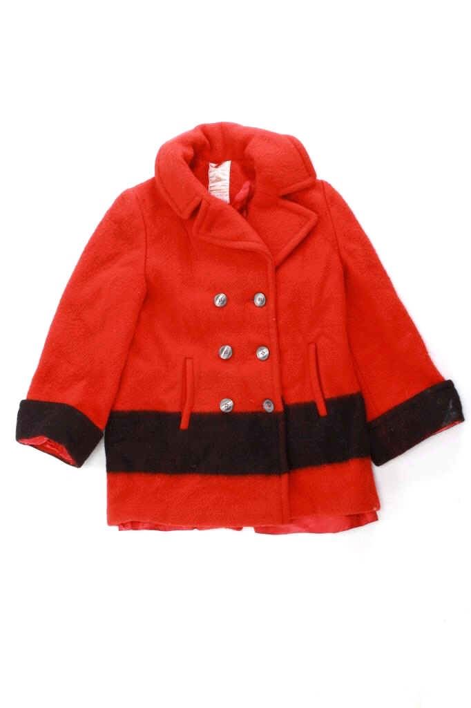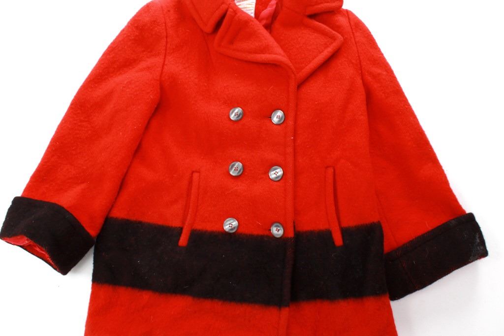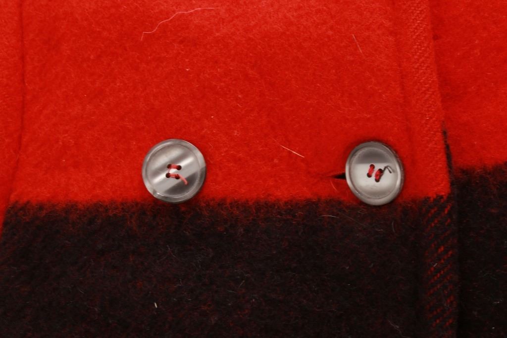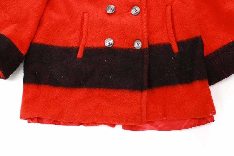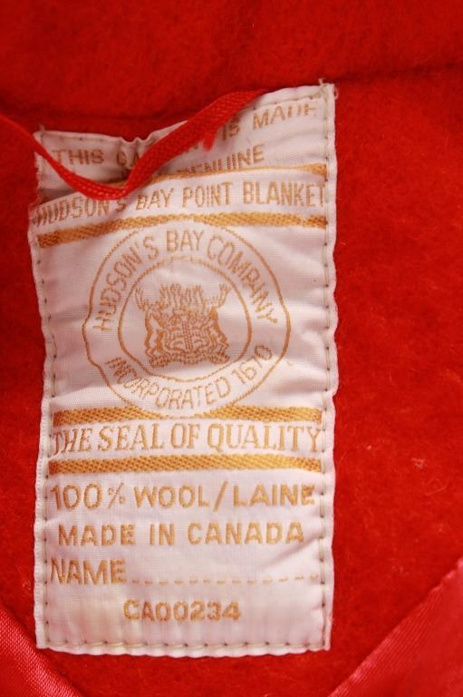 Featured in this lot is this Hudson Bay Co. red point button up coat. The coat features a wonderfully and professionally crafted wool construction that features a red field with a strip of black towards the bottom of the coat. The coat features three buttons with three button decoration next to them. The tag is the coats original Hudson Bay Co. point tag. The condition of this Hudson Bay Co. jacket is good with no obvious signs of damage and shows good overall condition. The measurements of this of this coat is 30 1/2" x 31 1/2".
