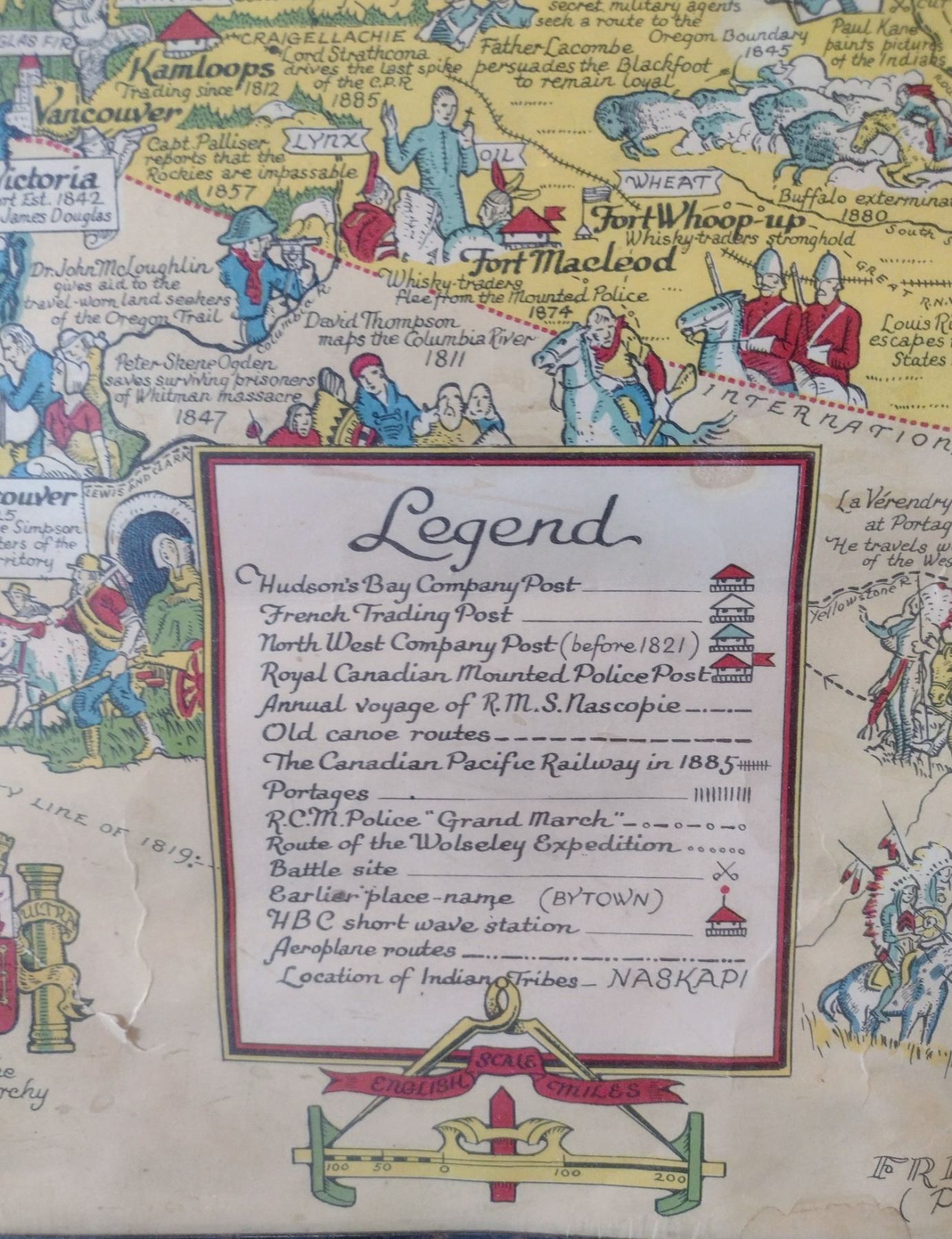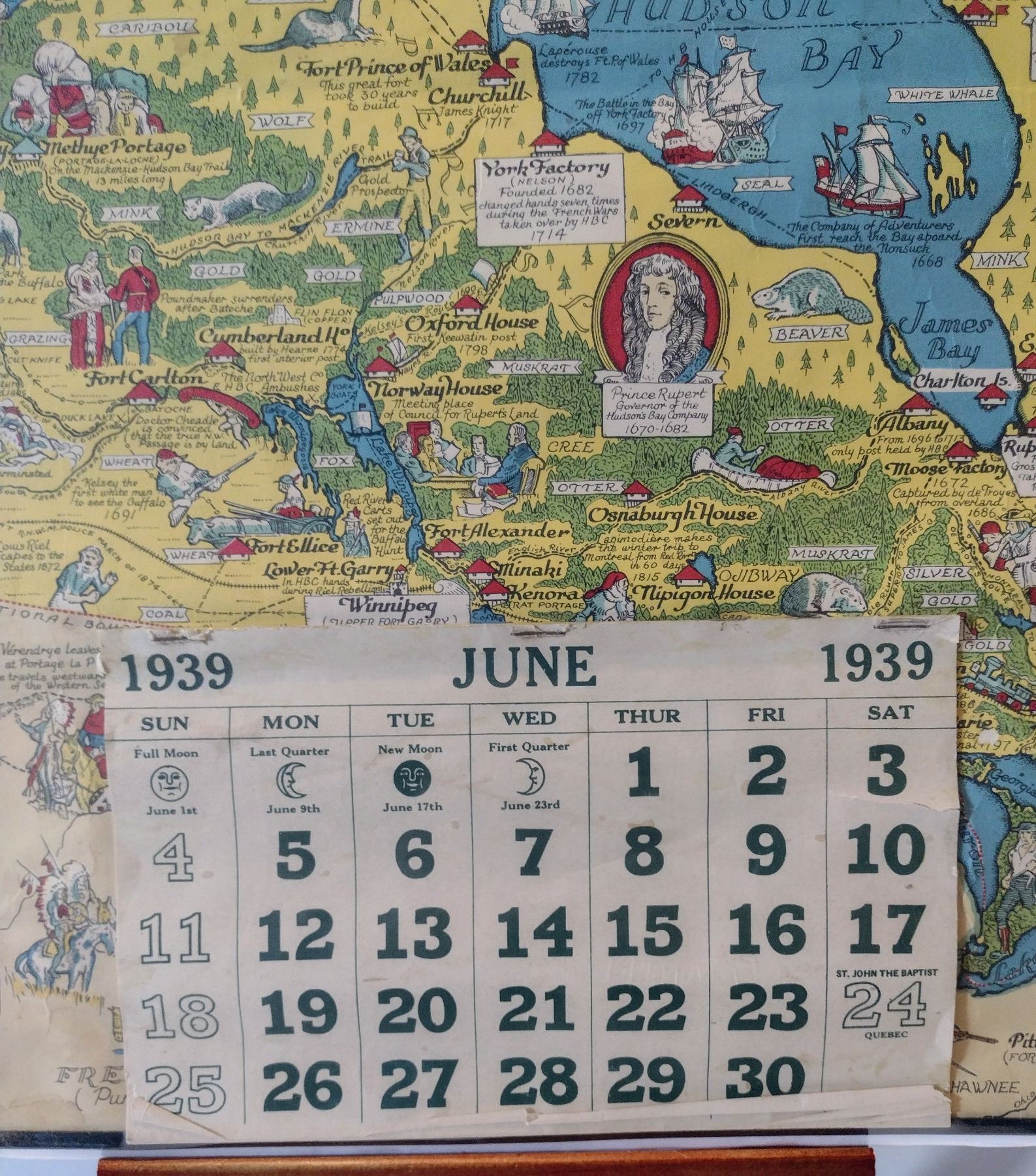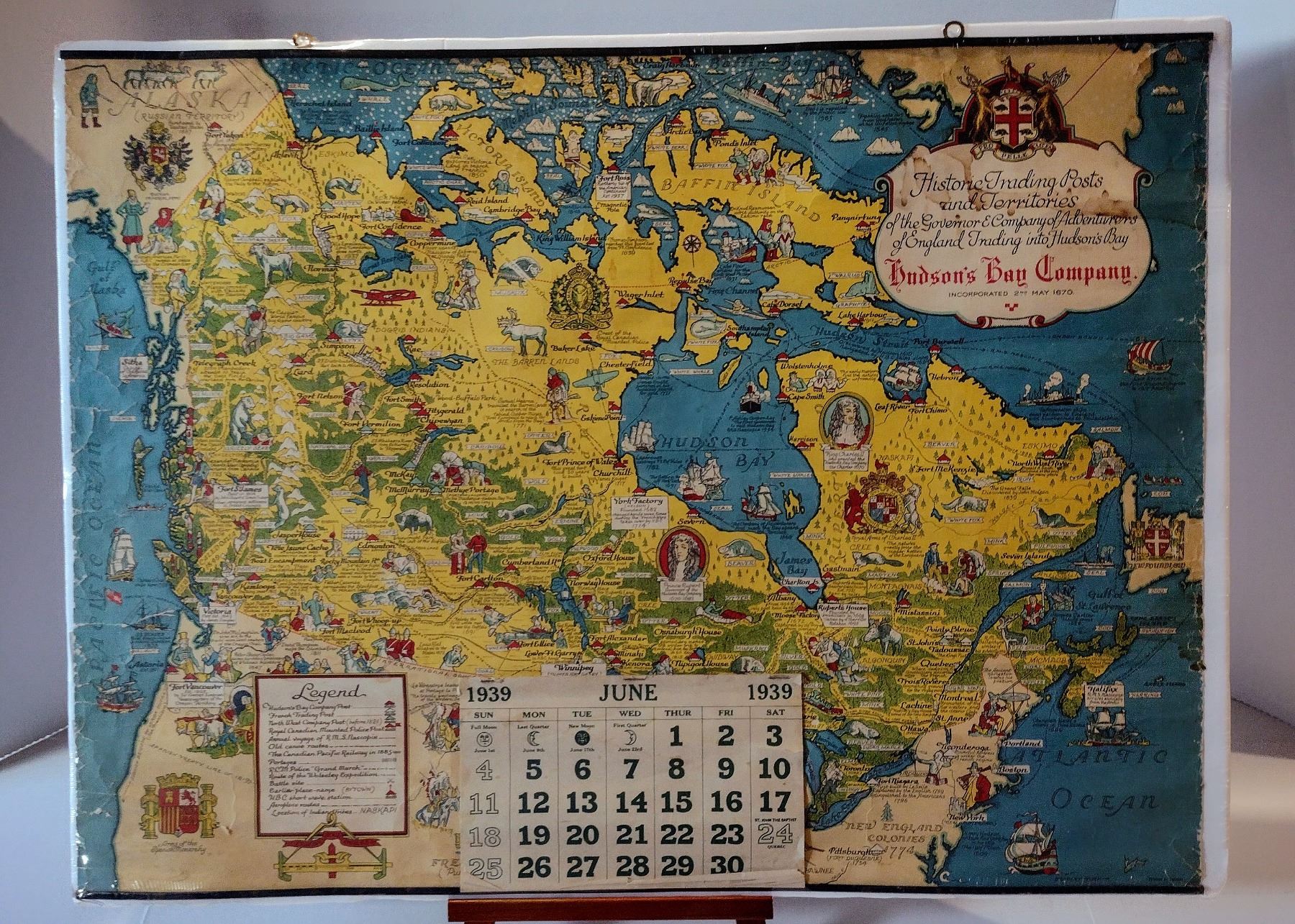 Hudson Bay Company 1939 calendar outlining Historic Fur Trading posts. Great 26 inches in length, 19 ½ inches in width.