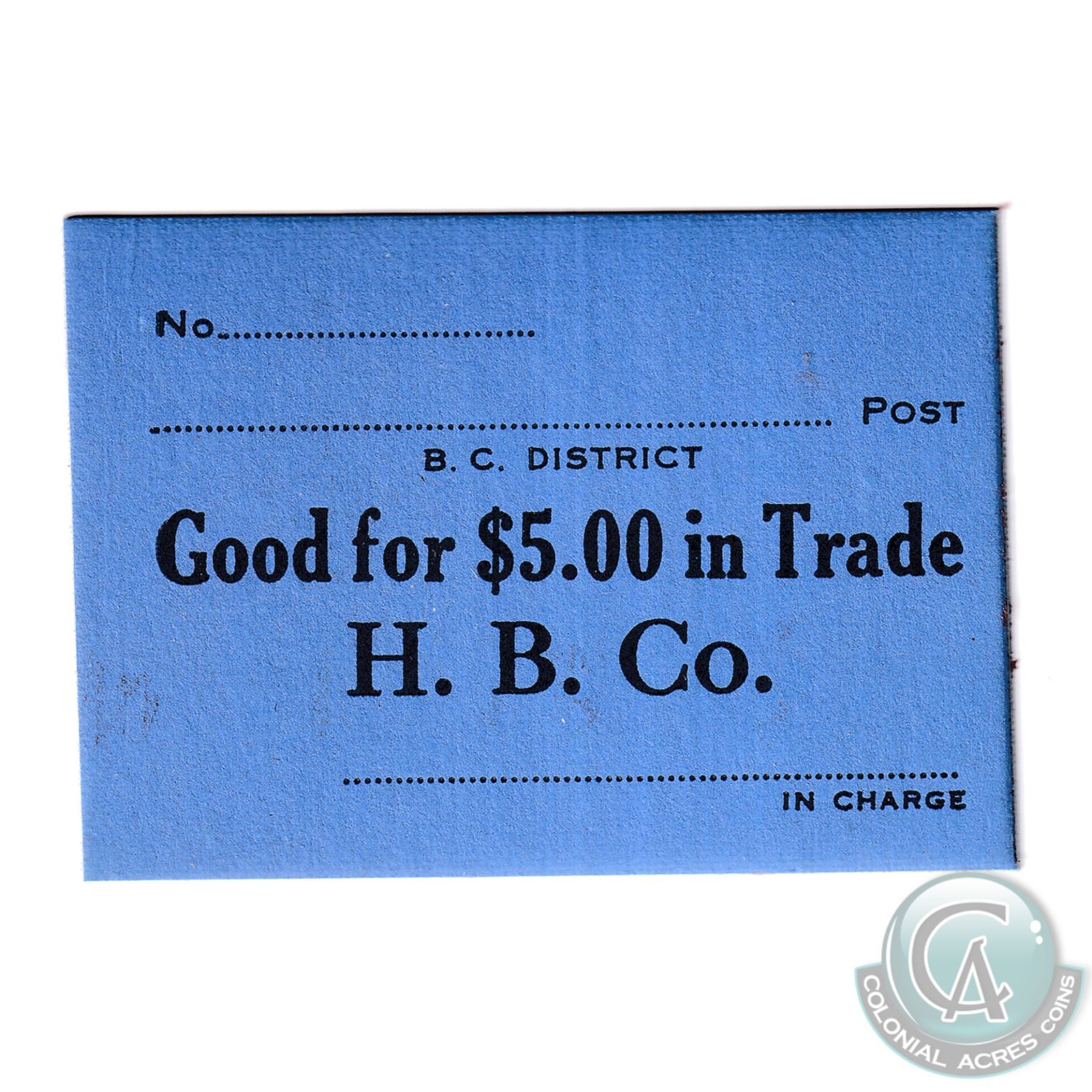 Hudson Bay Company Generic Note for $5.00 in Trade. No Date. Blue Cardboard with Black Printing. 64mm x 44mm. Gingras 386. CH-BC10-18-08Ra. Maroon cloth backing. Believed to be a reproduction produced in the 1960's.