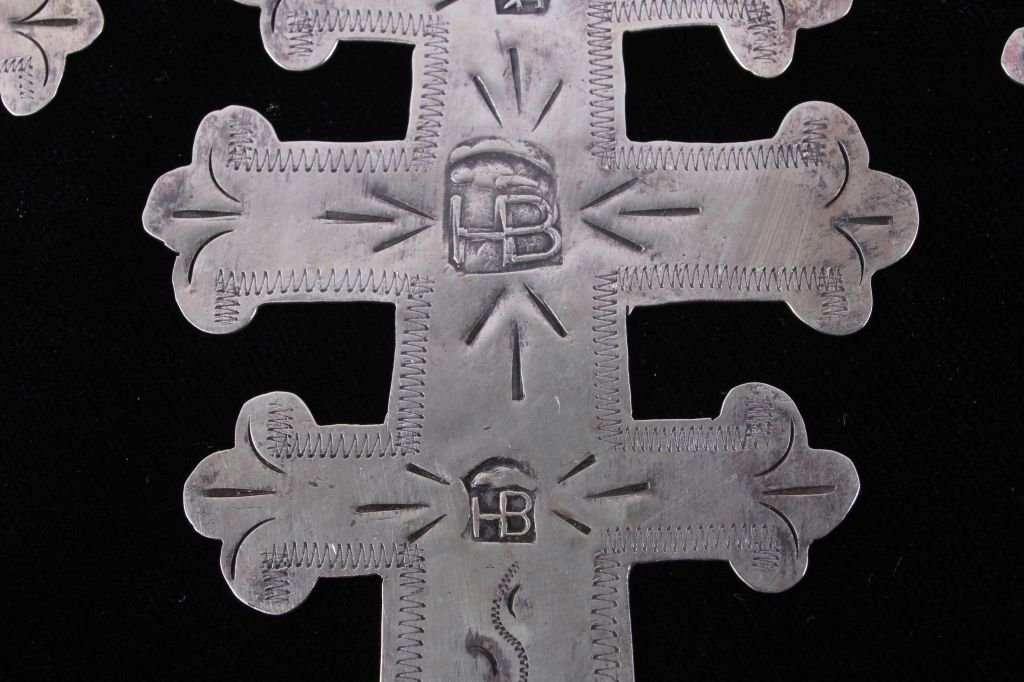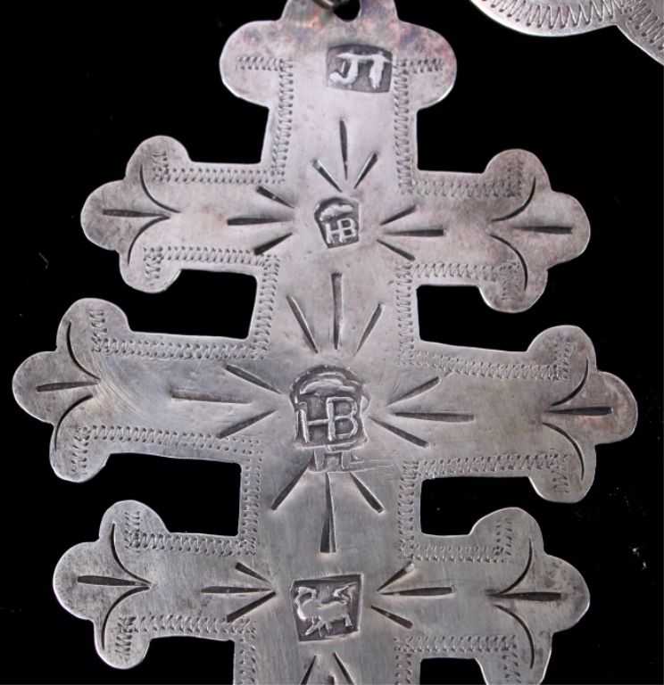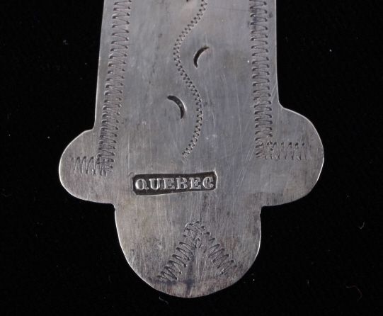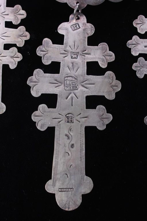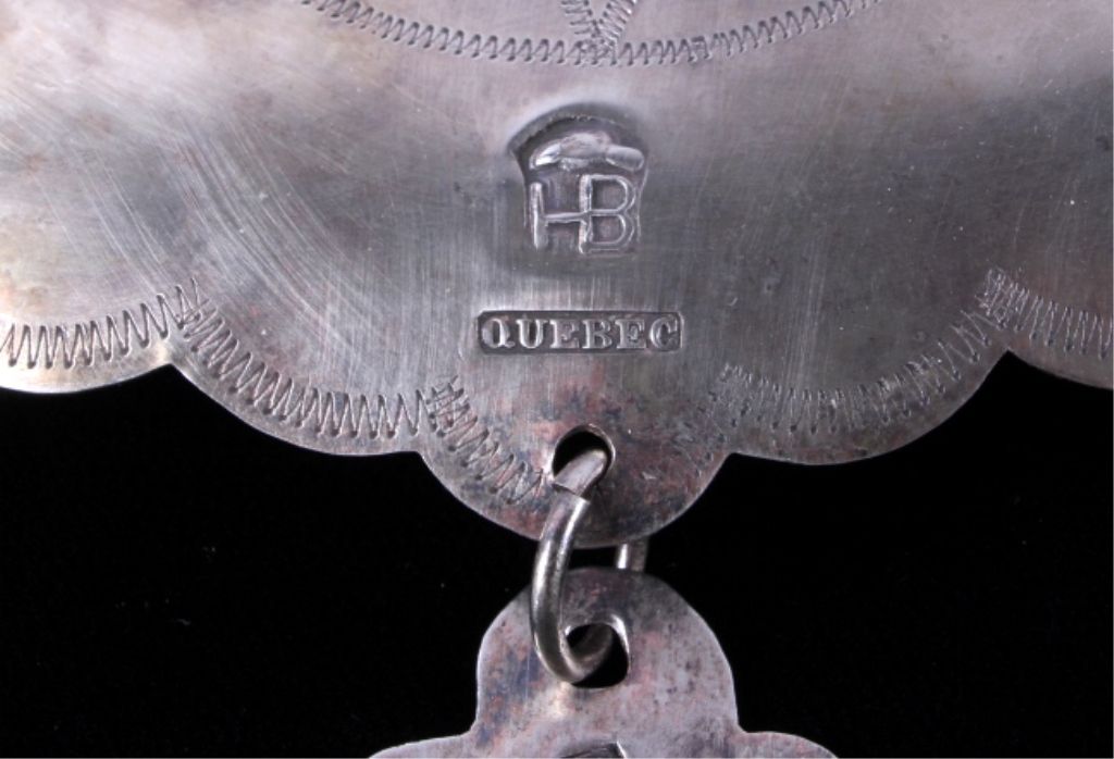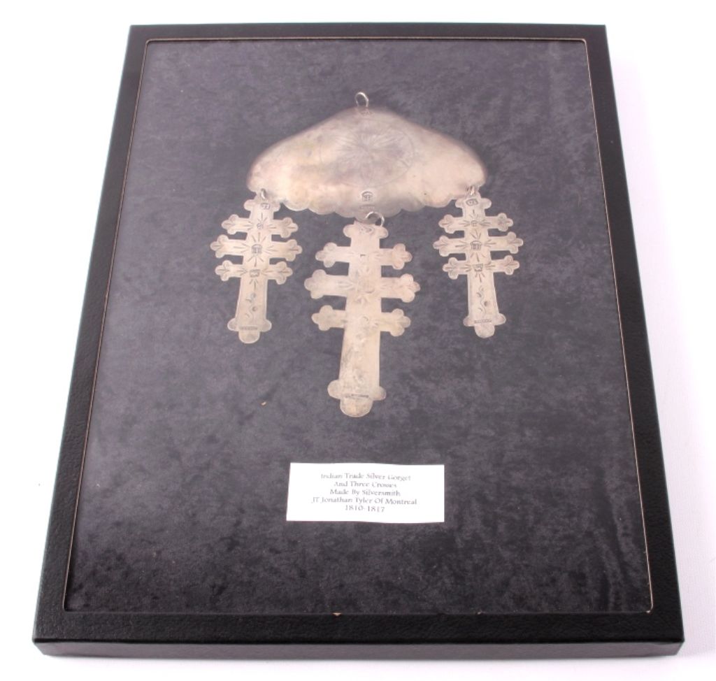 The lot features an original Native American Indian Trade Silver Gorget made by J.T. Jonathan Tyler of Montreal, Quebec, Canada 1810-1817. The early artifact shows three triple bar or papal engraved crosses (rarereligious piece from the Native Americans). The rare piece is over 200 year old was hand crafted using solid silver and has an impressive design and great condition. This is from the Montreal Hudson Bay Fur Co. andis hallmarked as so and also signed (marked with the sterling hallmark). Measures 9.75"x7.5" in a glass top black case 16.5"x12.5" The rare piece is in a black display case with glass top.