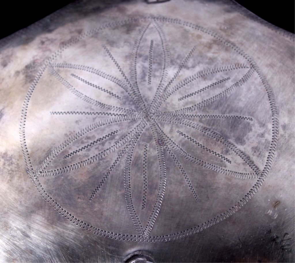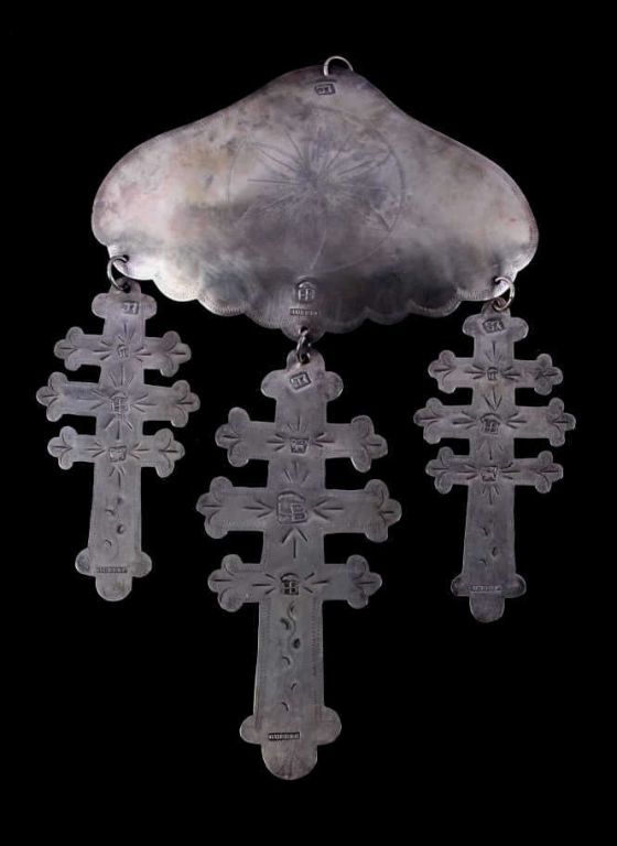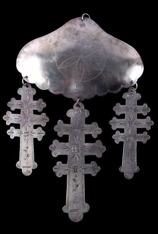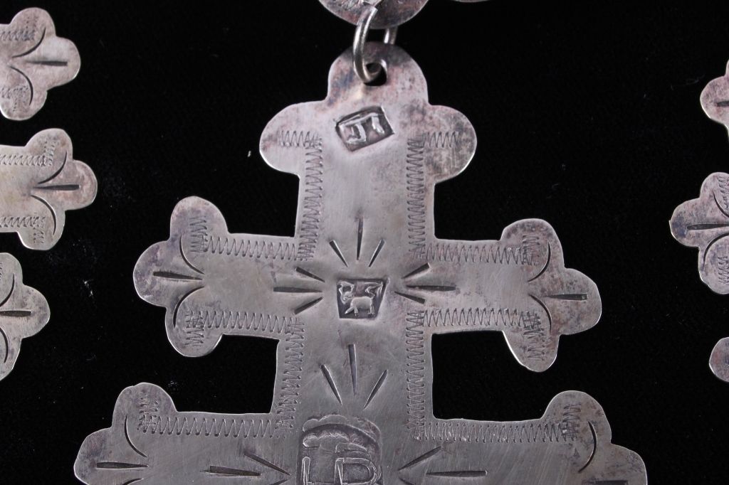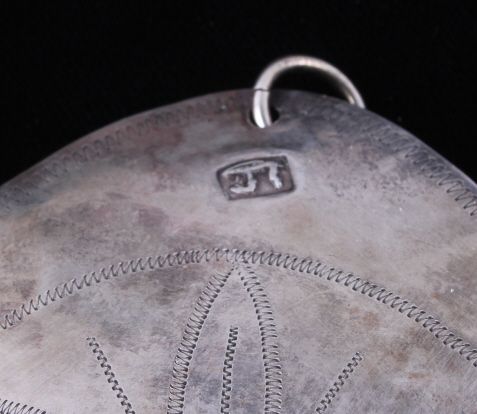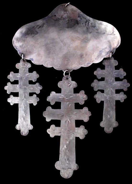The lot features an original Native American Indian Trade Silver Gorget made by J.T. Jonathan Tyler of Montreal, Quebec, Canada 1810-1817. The early artifact shows three triple bar or papal engraved crosses (rarereligious piece from the Native Americans). The rare piece is over 200 year old was hand crafted using solid silver and has an impressive design and great condition. This is from the Montreal Hudson Bay Fur Co. andis hallmarked as so and also signed (marked with the sterling hallmark). Measures 9.75"x7.5" in a glass top black case 16.5"x12.5" The rare piece is in a black display case with glass top.