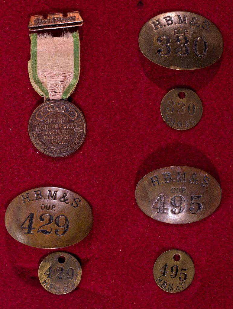 This lot consists of 7 items. There are 3 badges; each has their own smaller matching tag. Each one has the title of “H.B.M &S” then following a Dup. number. The numbers are #330, #429 and #495. Lastly there is a ribbon and medal for the 50th Anniversary of the Mystic Lodge of Hancock Michigan. The pin attached to the ribbon is in the same of an ingot for the Copper Country IOOF Anniversary. The ribbon has some wear and is detached from the pin. -61808
