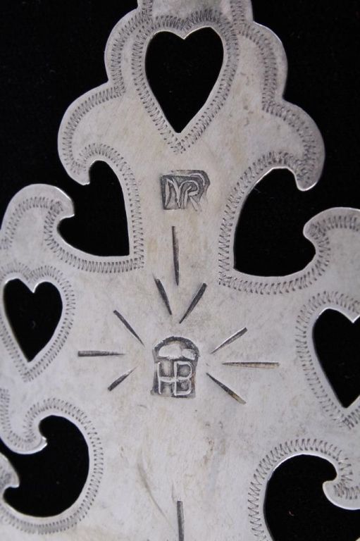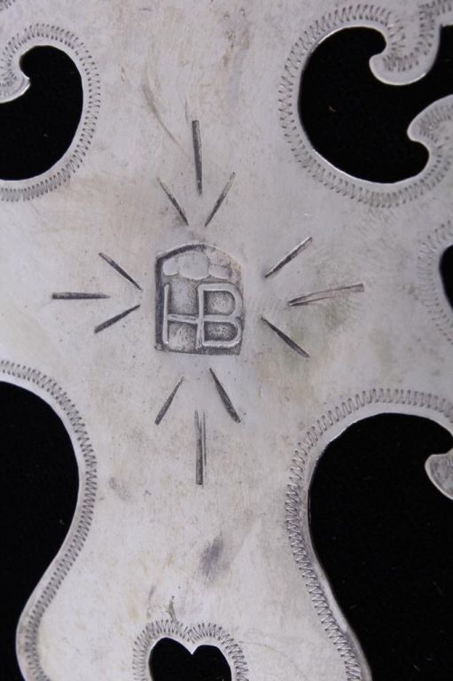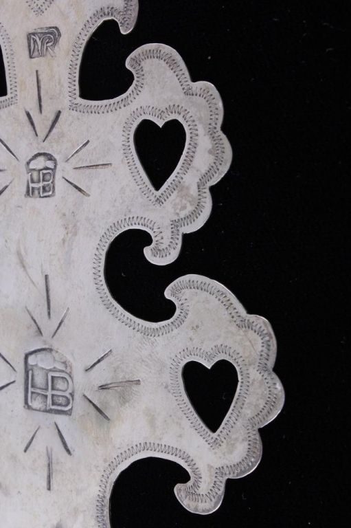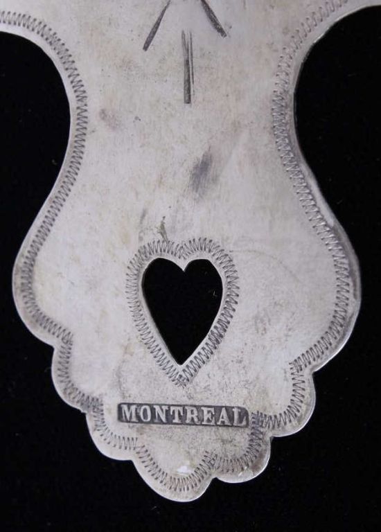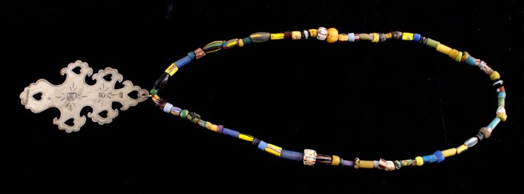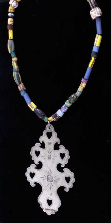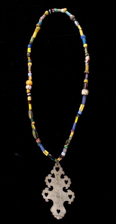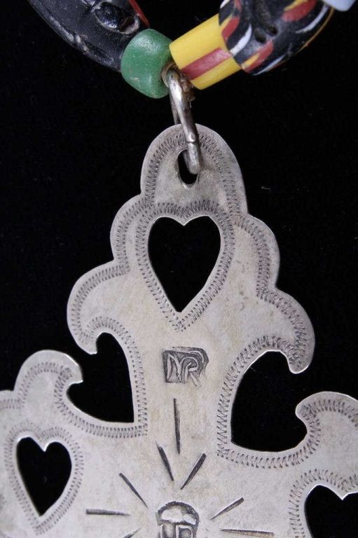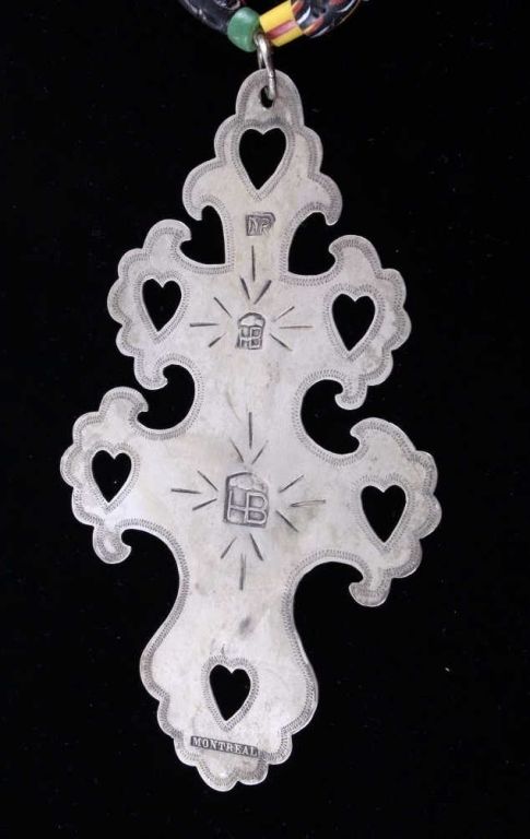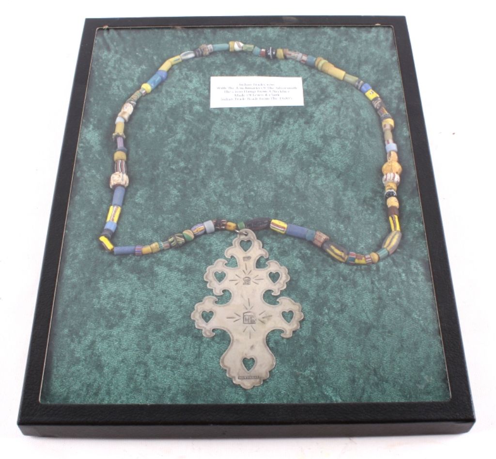 This is an original hand worked piece done by a silversmith of the Montreal Hudson Bay Fur Co. This piece was was made 1780-1840 an shows impressive work having the HB, NR, and Montreal hallmarks. The necklace also features an original strand of Lewis & Clark Venetian Millefiori faceted trade beads from the early 1800's to 1700's on sinew. Rare set of trade beads. The cross measures 3.25"x5.5"" and he bead strand measures 16.25 long strung. In a black box with glass top that measures 12.25"x16.25"