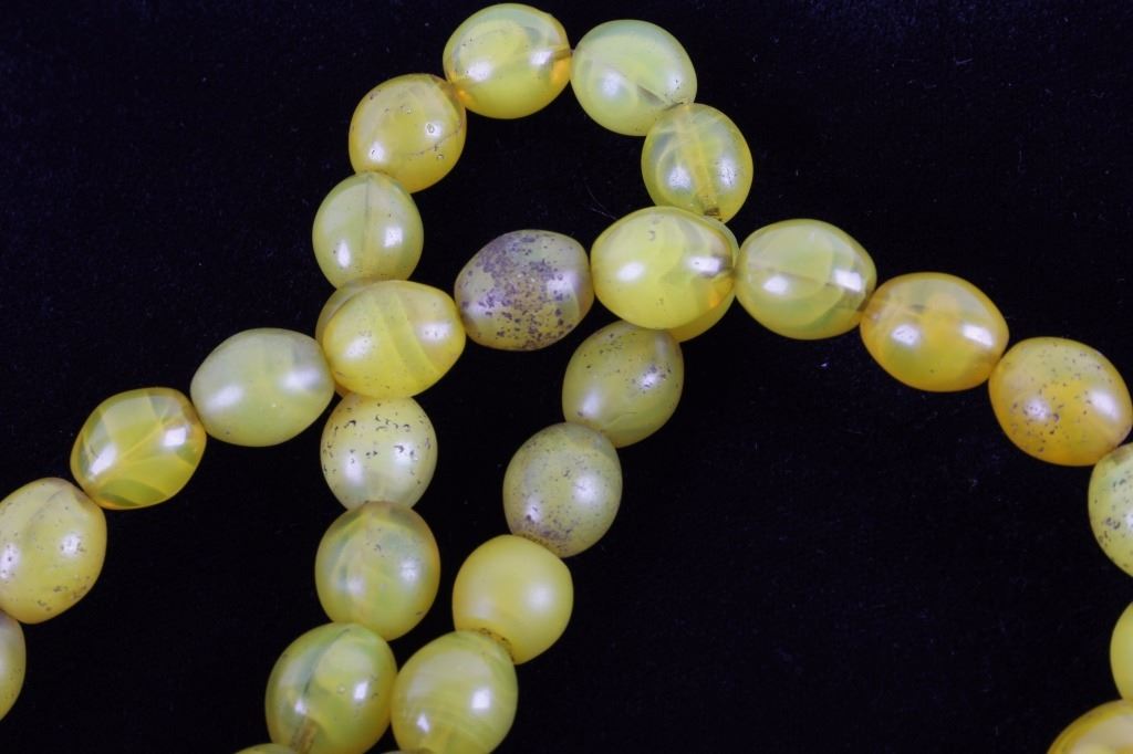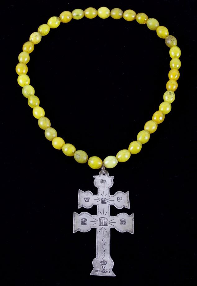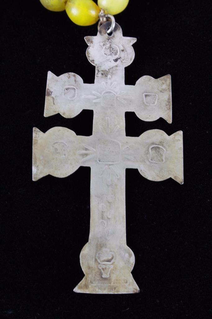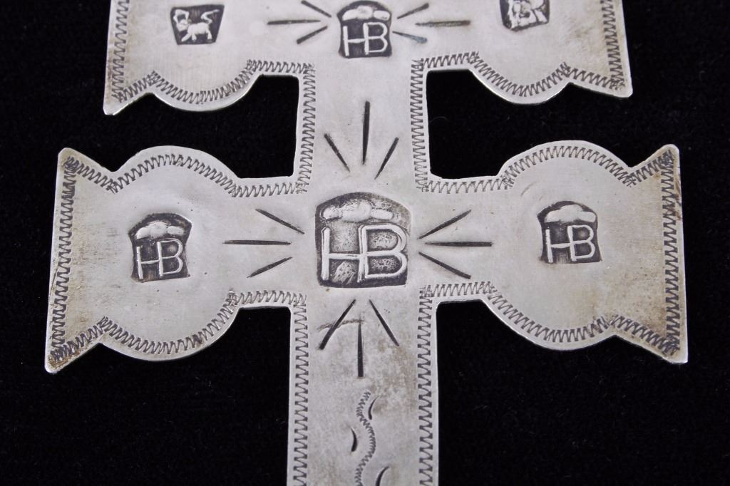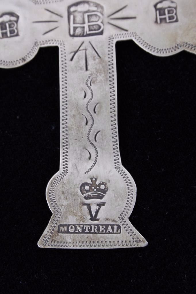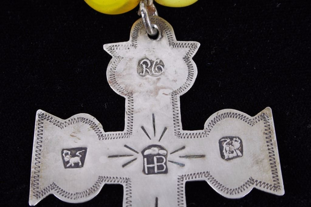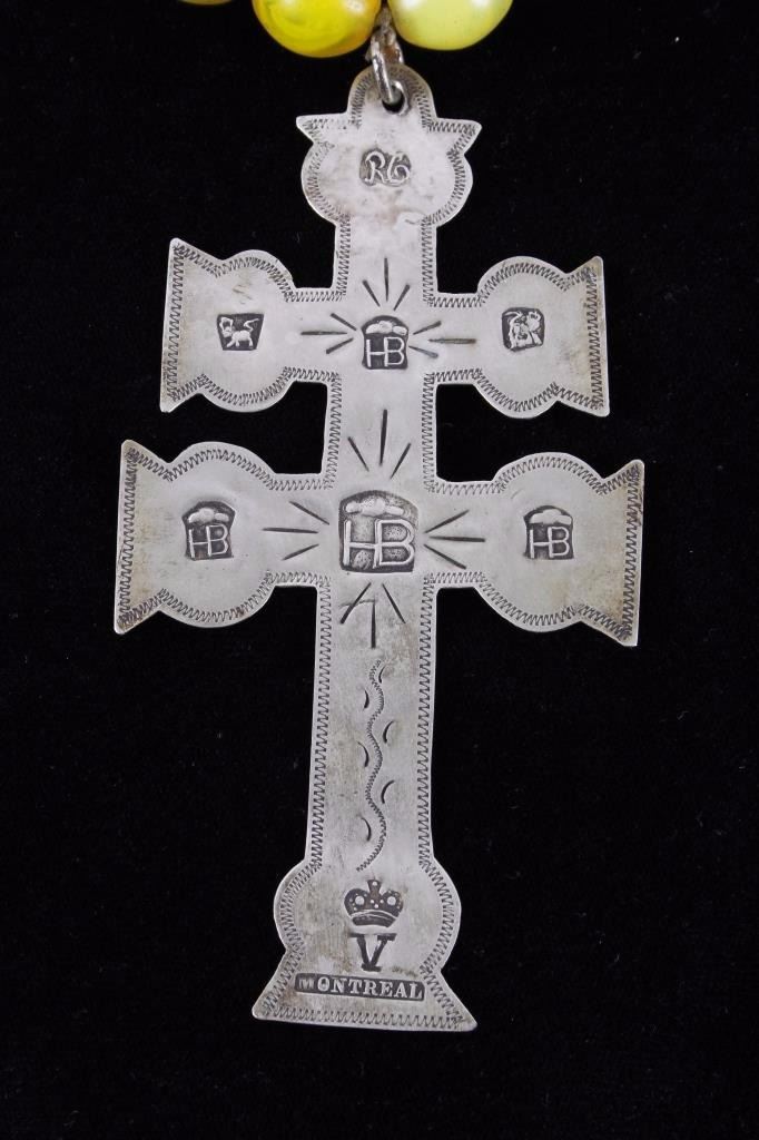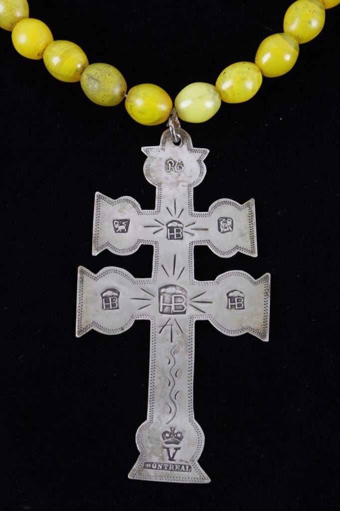 This is an original Hudson Bay Fur Co. of Montreal worked silver trade cross with early trade bead necklace. The piece is from the late 18th century to early 19th century. The piece shows the correct “(beaver over top) HB” hallmarks, with walking lion sterling mark, “RG” signature, crown over “V” and Montreal touch mark. The cross has a rocker engraved outer edge and is on a sinew necklace with various early Hudson Bay Venetian wound glass yellow Vaseline trade beads. The silver cross has been moderately wiped (or cleaned) with some original patina remaining. The cross is 2.5”x4 7/8”. The necklace is 23.5” in circumference. Similar hallmarked "RG" Montreal Hudson Bay silver cross gorget necklaces have sold for over $2,300.
