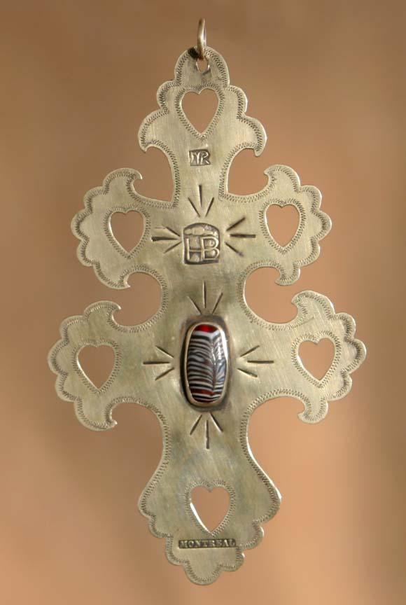 Hudson Bay Trade Silver Cross. 3" x 5 ½". Double barred engraved cross. Hallmarked "HB" with a beaver & "Montreal". Heart cut outs & a bezel set trade bead. (est $1,000-1,500). For condition reports please visit: www.auctioninsantafe.com/cr2011.pdf