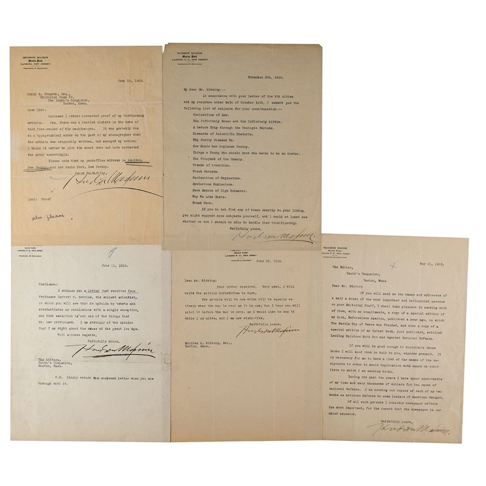 Five TLSs, each approximately 8.5 x 11, dated between 1909 and 1918, personal Maxim Park letterhead. The letters are addressed to Henry S. Chapman of the Youth’s Companion, Boston, Mass, and Mr. Rideing, also of Boston. On November 5, 1912, Maxim mentions article topics he is interested in pursuing, including, “Curiosities of Law,” “The Infinitely Great and the Infinitely Little,” “A Return Trip Through the Geologic Periods,” “The Vineyard of the Memory,” “Freaks of Invention,” “Curiosities of Explosions,” and “Why We Like Music,” amongst others. Additionally, Maxim references his books, Defenseless America and Leading Opinions Both For and Against National Defense, and goes on to argue his point that, despite the criticism of an editor, “I am strongly of the opinion that I am right about the cause of the great Ice Age.” In his last letter, June 23, 1918, Maxim agrees to “write the article Curiosities in Guns,” a work he states “will be one which will be equally as timely when the war is over as it is now; but I hope you will print it before the war is over, as I would like to see it while I am still alive, and I am now sixty-five.” In very good to fine condition, with some creasing to the earliest letter.