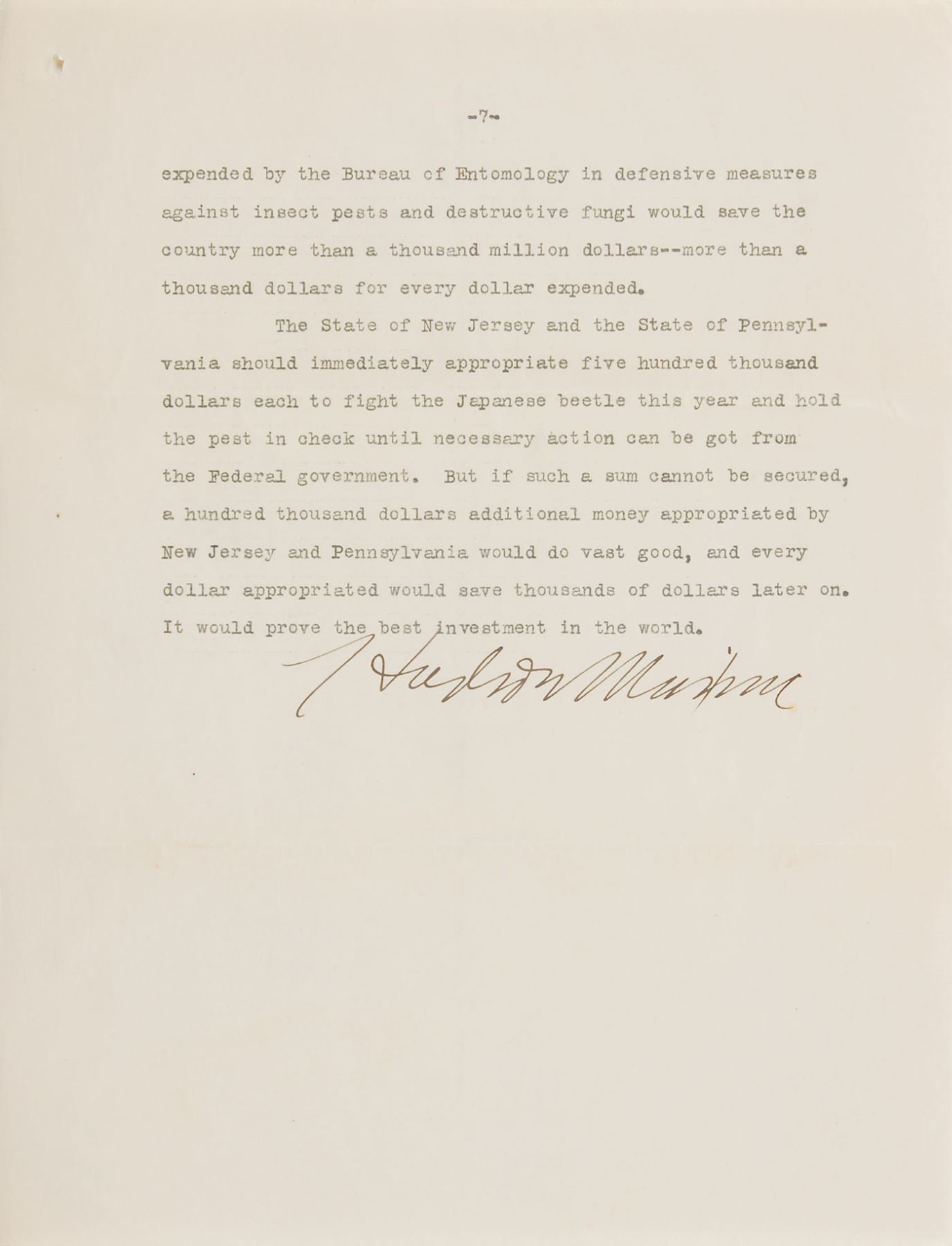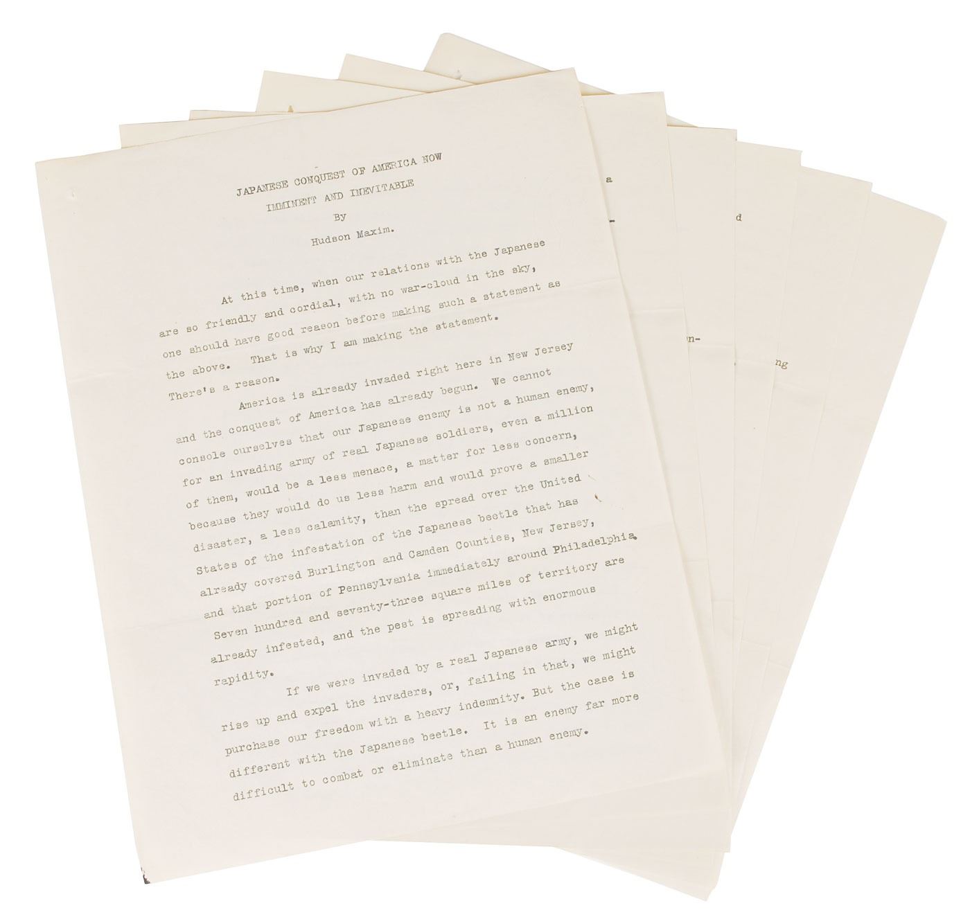 Typed manuscript for an article entitled "Japanese Conquest of America Now Imminent and Inevitable," seven pages, 8.5 x 11, no date but circa 1923, signed at the conclusion in black ink by Hudson Maxim. After opening with rising concerns of an imminent Japanese invasion, the article soon clarifies that the invaders are not human but rather insect, in part: "If we were invaded by a real Japanese army, we might rise up and expel the invaders, or, failing in that, we might purchase our freedom with a heavy indemnity. But the case is different with the Japanese beetle. It is an enemy far more difficult to combat or eliminate than a human enemy. The insect hatches out underground in the form of a grub, which attacks and eats the roots of grass and every growing thing. When mature, it emerges in the form of a flying beetle about half an inch long, which attacks and voraciously devours all kinds of garden produce, all kinds of fruit trees and all kinds of fruit, and all kinds of leaf-bearing shrubs and trees. The season of infestation is so long that the beetles give the trees no time to releaf and recover, and the trees die within three years. The Japanese beetle is the most all-devouring, the most universally destructive insect pest in the world. It is, furthermore, wonderfully hardy, and multiplies with astounding rapidity. The beetle is a strong flier, which enables it to spread rapidly." In fine condition, with a file hole to the upper left corner of each page. Accompanied by a copy of a letter related to the article, dated March 12, 1923.