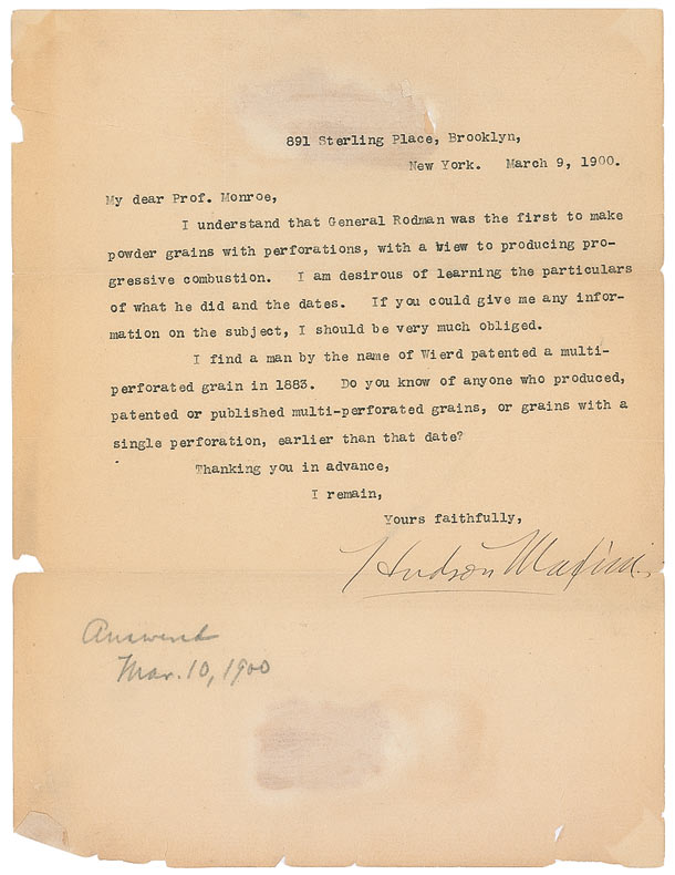 American chemist and inventor (1853–1927) best known for several innovations related to explosives, including smokeless gunpowder. TLS, one page, 8 x 10.5, March 9, 1900. Letter to Professor Monroe. In full: “I understand that General Rodman was the first to make powder grains with perforations, with a view to producing progressive combustion. I am desirous of learning the particulars of what he did and the dates. If you could give me any information on the subject, I should be very much obliged. I find a man by the name of Wierd patented a multi-perforated grain in 1883. Do you know anyone who produced, patented or published multi-perforated grains, or grains with a single perforation, earlier than that date?” In good condition, with two horizontal folds, with a partial separation through the fold through signature, scattered creases and wrinkles, mounting remnants to reverse, small tear to top edge, and several edge tears. Important correspondence in regards to the development of explosives.