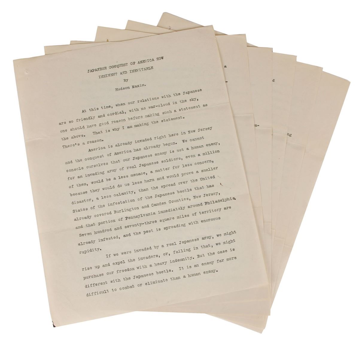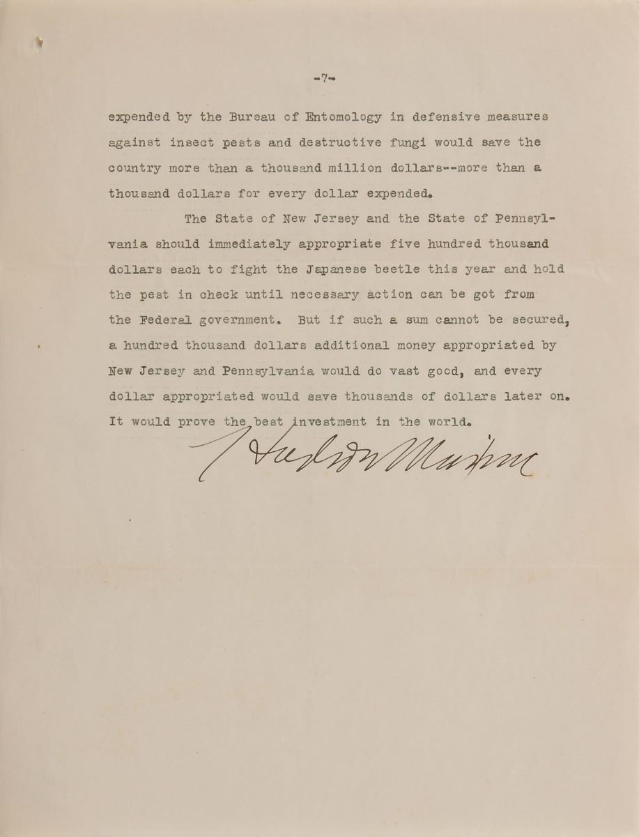 American chemist and inventor (1853–1927) best known for several innovations related to explosives, including smokeless gunpowder. Uncommon typed manuscript, seven pages, 8.5 x 11, no date but circa 1923, signed at the conclusion in black ink. The article, entitled "Japanese Conquest of America Now Imminent and Inevitable," after opening with rising concerns of an imminent Japanese invasion, soon clarifies that the invaders are not human but insect, in part: "If we were invaded by a real Japanese army, we might rise up and expel the invaders, or, failing in that, we might purchase our freedom with a heavy indemnity. But the case is different with the Japanese beetle. It is an enemy far more difficult to combat or eliminate than a human enemy. The insect hatches out underground in the form of a grub, which attacks and eats the roots of grass and every growing thing. When mature, it emerges in the form of a flying beetle about half an inch long, which attacks and voraciously devours all kinds of garden produce, all kinds of fruit trees and all kinds of fruit, and all kinds of leaf-bearing shrubs and trees. The season of infestation is so long that the beetles give the trees no time to releaf and recover, and the trees die within three years. The Japanese beetle is the most all-devouring, the most universally destructive insect pest in the world. It is, furthermore, wonderfully hardy, and multiplies with astounding rapidity. The beetle is a strong flier, which enables it to spread rapidly." In fine condition, with a file hole to the upper left corner of each page. Accompanied by a copy of a letter related to the article, dated March 12, 1923. Pre-certified PSA/DNA.