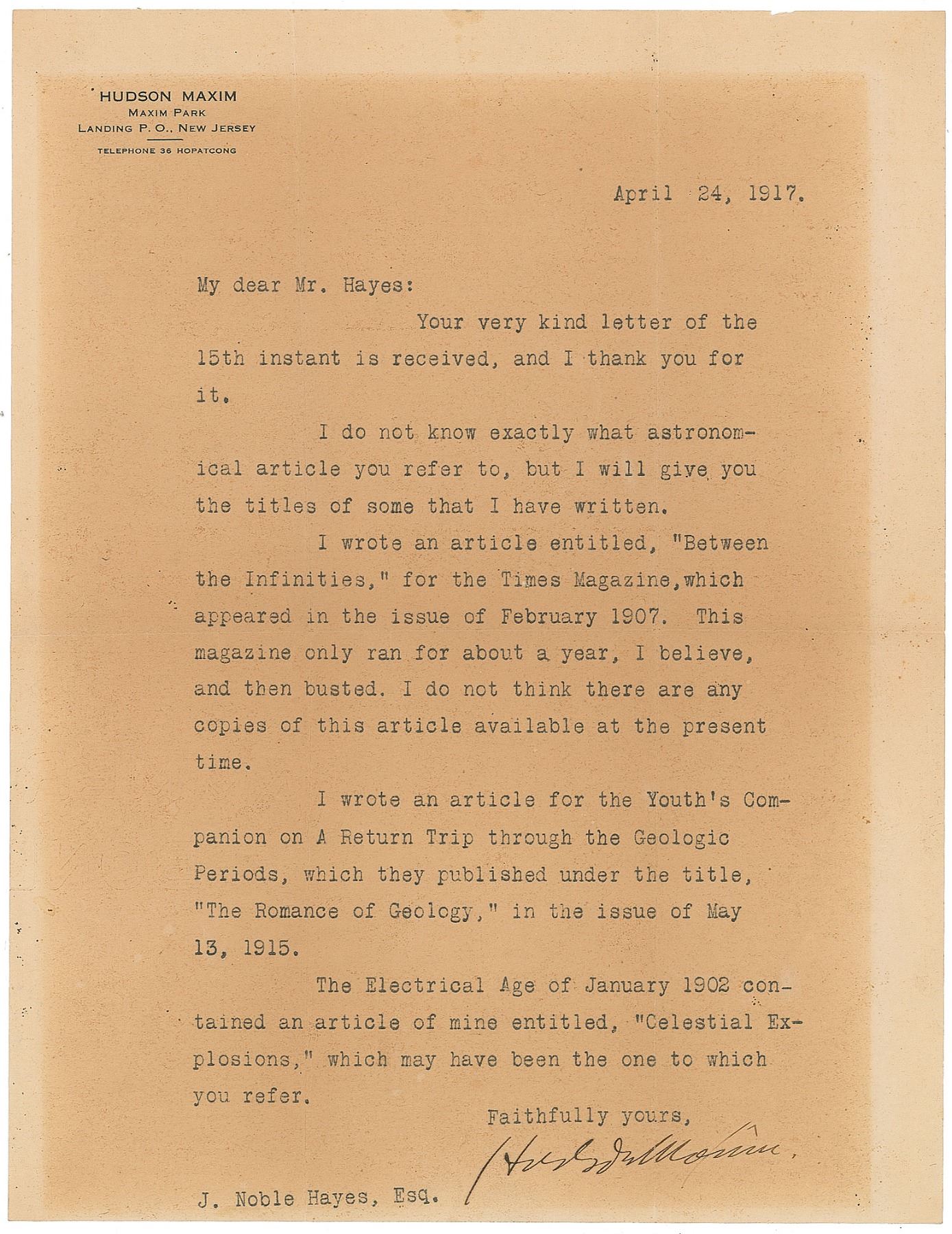 American chemist and inventor (1853-1927) best known for several innovations related to explosives, including smokeless gunpowder. Two TLSs, both one page, 8.5 x 11, dated May 3, 1911, and April 24, 1917. The earlier letter, which Maxim has annotated along the bottom, "Personal," is addressed to Eugene V. Brewster, in part: "Sometime ago Mr. J. F. Tucker, the President of Twilight Club, asked me to send him a list of the names of persons who might possibly like to receive notices of the discussions of the Twilight Club…Now I learn that he as written a personal letter to each, enclosing an announcement of dinner…at a cost of Two Dollars, stating that it is I who make the request. I think there is a little mistake somewhere: for when I ask my friends to attend a dinner, I am not in the habit of asking them to pay." The second letter is written on his personal letterhead and addressed to J. Noble Hayes, in part: "I do not know exactly what astronomical article you refer to, but I will give you the titles of some that I have written. I wrote an article entitled, 'Between the Infinities,' for the Times Magazine, which appeared in the issue of February 1907…I wrote an article for the Youth's Companion on A Return Trip through the Geologic Periods, which they published under the title, 'The Romance of Geology,' in the issue of May 13, 1915. The Electrical Age of January 1902 contained an article of mine entitled, 'Celestial Explosions,' which may have been the one to which you refer." In overall very good condition, with creasing, toning, and splitting along folds. Accompanied by the original mailing envelope for the later letter, as well as a book photo of Maxim bearing a preprinted signature.