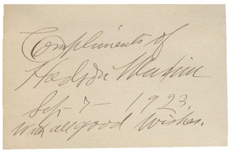 Hudson Maxim (1853 – 1927). U.S. inventor and chemist who invented a variety of explosives, including smokeless gunpowder. He was the brother of Hiram Stevens Maxim, inventor of the Maxim gun and uncle of Hiram Percy Maxim, inventor of the Maxim Silencer. Signed card. 4 3/4" x 3". "Compliments of Hudson Maxim, Sept. 7, 1923. With all good wishes. Excellent.