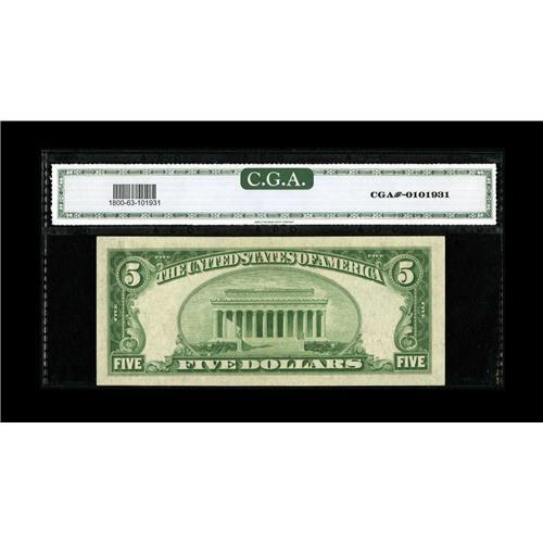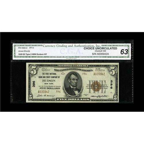<B>Hudson, NY</B></I> - $5 1929 Ty. 2 <B>The First NB and TC</B></I> Ch. # 396<BR>A nicely centered <B>CGA Choice Uncirculated 63</B></I> from a bank that issued all of its small size under this, its second title.<BR><BR><b>Shipping:</b> Coin/Currency (<a target="_blank" href="http://www.heritageauctions.com/common/shipping.php">view shipping information</a>)