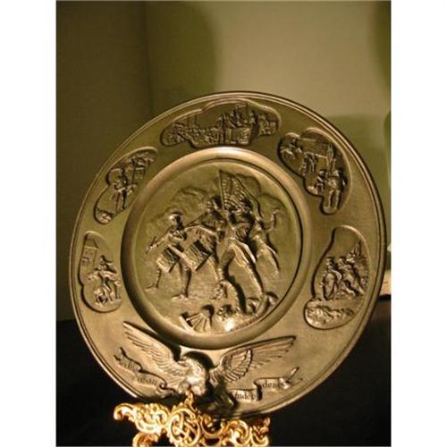 This 1776 American pewter charger, is made for Independence day by Hudson USA. This collectible plate is in excellent condition. It is historical and beautiful with inscriptions and signatures engraving, and is numbered. It is decorative, would make a perfect display. It is 9 inch in diameter. something to think about.