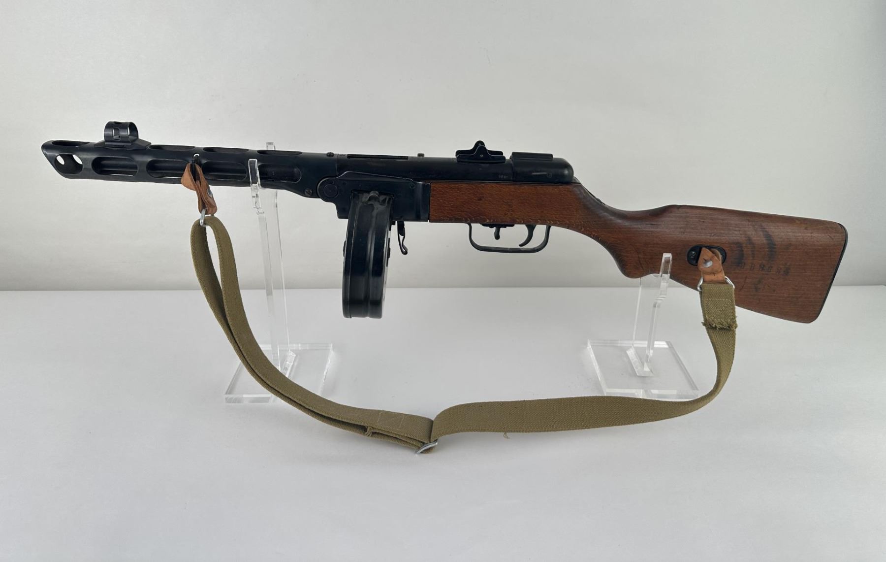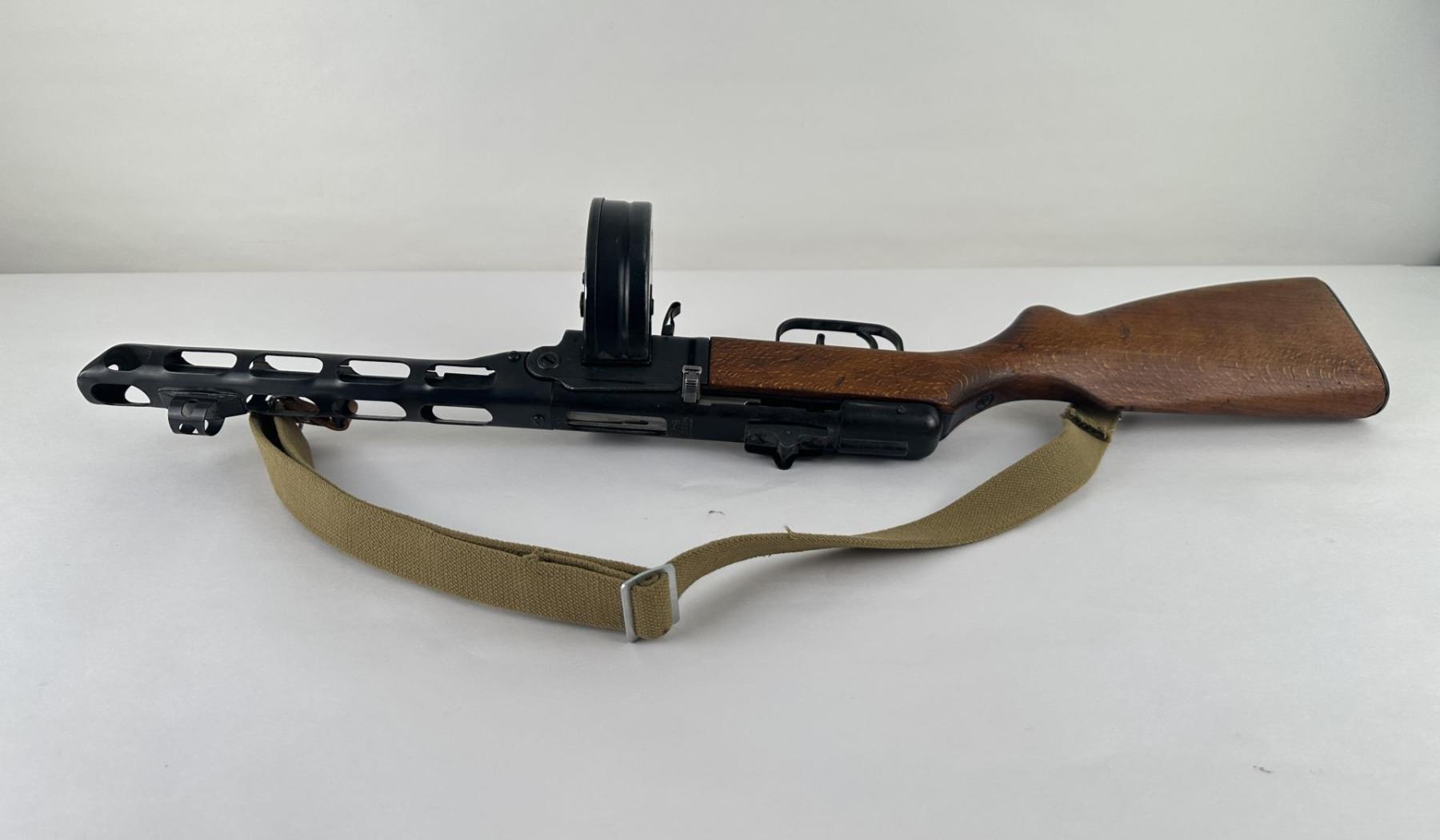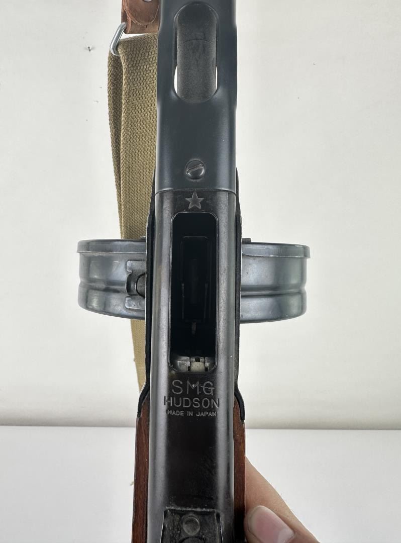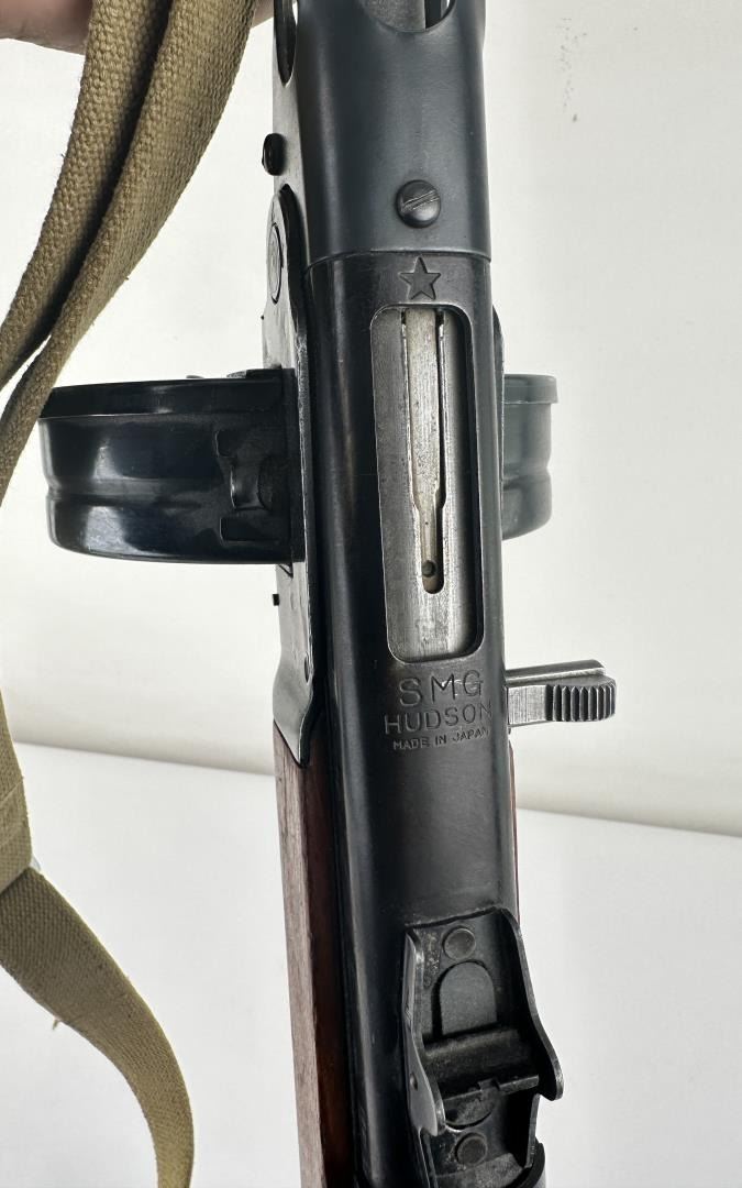Prop Gun. Made by the Hudson Toy Company in Japan. Not a firearm, does not require FFL transfer, no international sales. This is a 1982 dated Hudson Toy Company of Japan blank fire Russian PPSh 41 Submachine Gun SMG. These replica toys guns were built to extremely high quality standards and have become incredibly collectible in their own right. The example features a real hardwood stock with metal construction. Functional spring loaded thumb lever activated magazine release, functional trigger with bolt action that fires from the "open bolt" position, metal screws, fixed forward combat sights with adjustable rear sights, safety, all metal drum magazine and more. Entire replica will break down and function as the original but CANNOT BE MADE TO FIRE REAL AMMUNITION. This is not a gas operated gun and does not fire plastic pellets of BBs. Designed to fire brass blank blow back rounds (rounds are not included). When the brass cartridges are fitted with the proper caps, this replica is designed to fire in semi and full auto modes. The tolerances are tight and the machining is accurate. These replica blow-back blank guns are essentially very realistic and sophisticated toy cap guns. They ignite a small primer that fits into the brass cartridges which, when the trigger is pulled, creates a small ignition that in turn cycles the bolt to blowback, eject the spent casing, then chamber another round to repeat the process. It will fire in semi-automatic or full automatic mode. The brass cartridges are 100% reusable. Brass cartridges are not included. Overall condition of this example is excellent. Hudson replica guns have been used as props in major motion pictures for nearly 40 years. This is a rare opportunity to own one of the rarest Hudson replicas to ever come out of Japan.