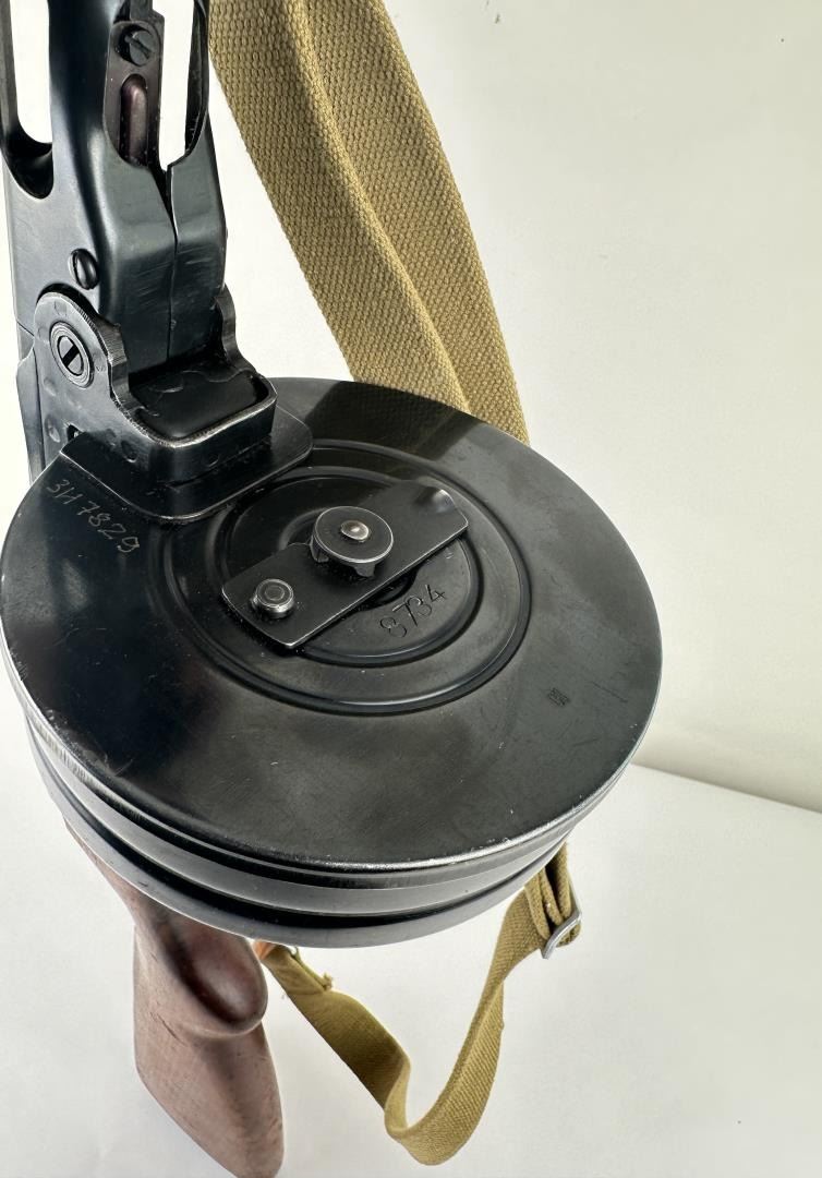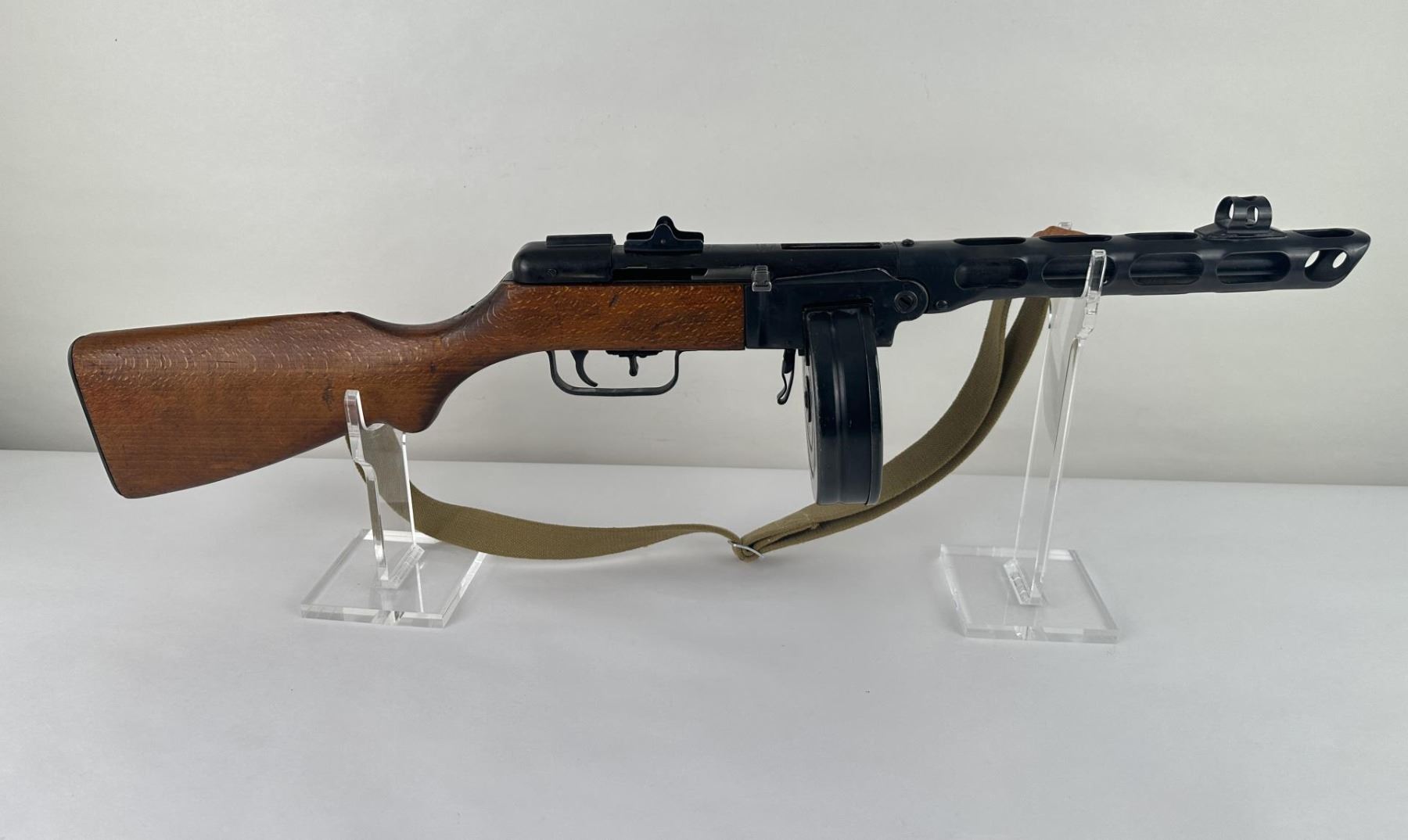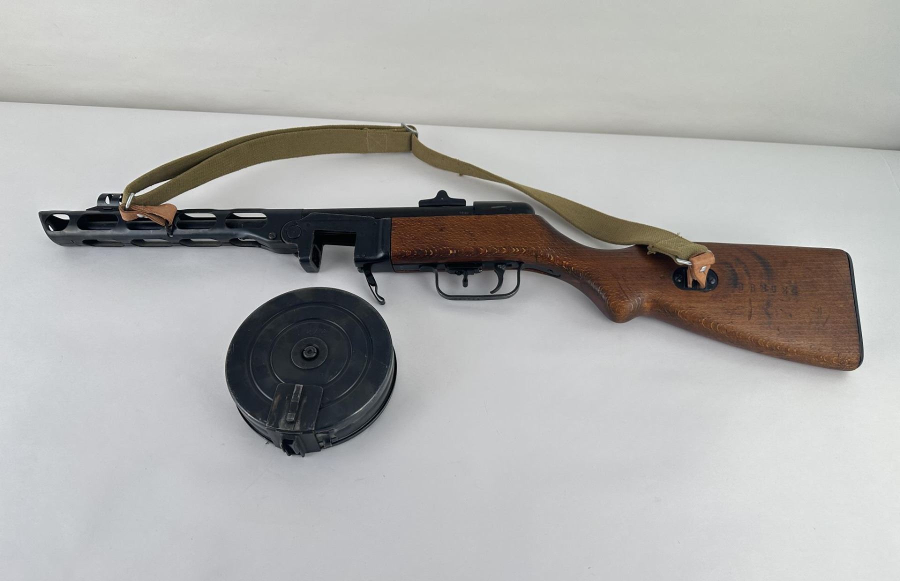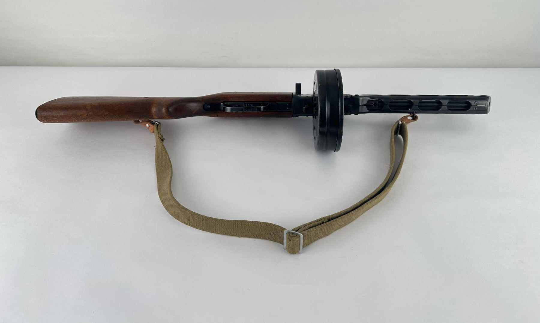 Prop Gun. Made by the Hudson Toy Company in Japan. Not a firearm, does not require FFL transfer, no international sales. This is a 1982 dated Hudson Toy Company of Japan blank fire Russian PPSh 41 Submachine Gun SMG. These replica toys guns were built to extremely high quality standards and have become incredibly collectible in their own right. The example features a real hardwood stock with metal construction. Functional spring loaded thumb lever activated magazine release, functional trigger with bolt action that fires from the "open bolt" position, metal screws, fixed forward combat sights with adjustable rear sights, safety, all metal drum magazine and more. Entire replica will break down and function as the original but CANNOT BE MADE TO FIRE REAL AMMUNITION. This is not a gas operated gun and does not fire plastic pellets of BBs. Designed to fire brass blank blow back rounds (rounds are not included). When the brass cartridges are fitted with the proper caps, this replica is designed to fire in semi and full auto modes. The tolerances are tight and the machining is accurate. These replica blow-back blank guns are essentially very realistic and sophisticated toy cap guns. They ignite a small primer that fits into the brass cartridges which, when the trigger is pulled, creates a small ignition that in turn cycles the bolt to blowback, eject the spent casing, then chamber another round to repeat the process. It will fire in semi-automatic or full automatic mode. The brass cartridges are 100% reusable. Brass cartridges are not included. Overall condition of this example is excellent. Hudson replica guns have been used as props in major motion pictures for nearly 40 years. This is a rare opportunity to own one of the rarest Hudson replicas to ever come out of Japan.