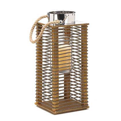 Hudson Tall Candle Lantern **|**|** This lantern blends old and new with the perfect mix of wire and wood accented by polished metal and an earthy rope loop. The interior glass candle holder is supported by a removable metal frame for easy lighting and candle replacement. SpecificationS: Item weight: 2.2 lbs. 6 1/2 x 6 1/2" x 15 1/2" high; candleholder: 3 1/2" x 3 1/2" x 5 1/4" high. Wood, stainless steel, and glass. Candle not included. UPC: 849179004675."