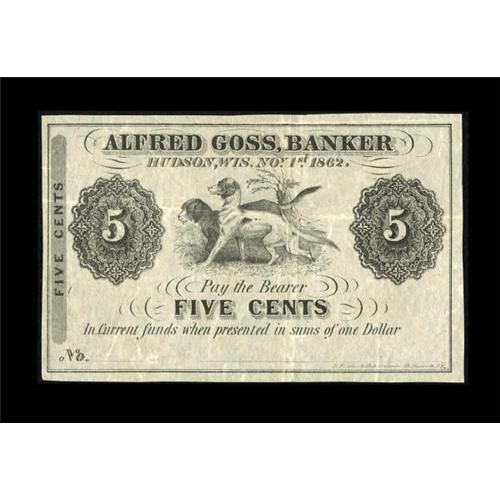 <B>Hudson, WI- Alfred Goss</B></I> 5c Nov. 1, 1862 Krause UNL<BR> A scarce note which is unlisted in this denomination in the Krause reference. <B>Extremely Fine.</B></I><BR><BR><b>Shipping:</b> Coins & Currency (<a target="_blank" href="http://www.heritageauctions.com/common/shipping.php">view shipping information</a>)