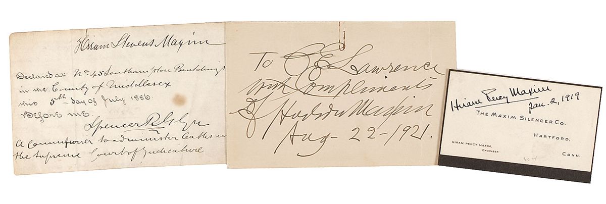 Inventor of the Maxim silencer for firearms, and inventor of smokeless gunpowder, respectively. Maxim Silencer Company business card, 3.75 x 2, affixed to a slightly larger black slip, signed on the front in fountain pen, “Hiram Percy Maxim, Jan., 2, 1919”; an ink signature and inscription, “To C. E. Lawrence, with compliments of Hudson Maxim, Aug-22-1921,” on an off-white 5.5 x 3.5 card; and an ink signature, “Hiram Stevens Maxim,” on an off-white 6 x 3.5 slip clipped from a larger document. In very good condition, with scattered soiling and a pencil notation to business card, and a rusty paperclip mark and vertical crease to Hudson’s card and Hiram’s slip.