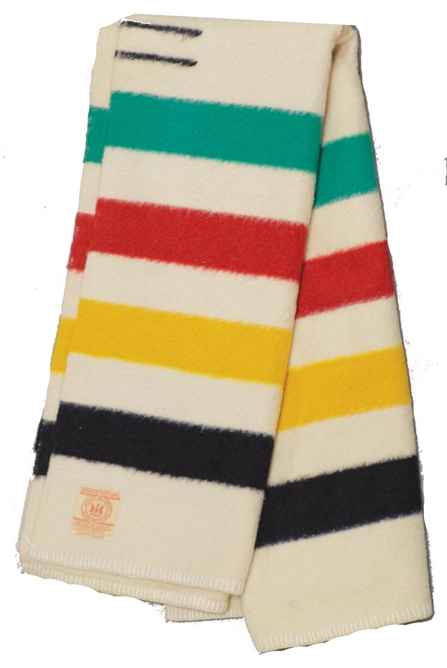 Mid 1900s, Outstanding all-wool blanket with original label and traditional, colored stripes. 79" x 62"