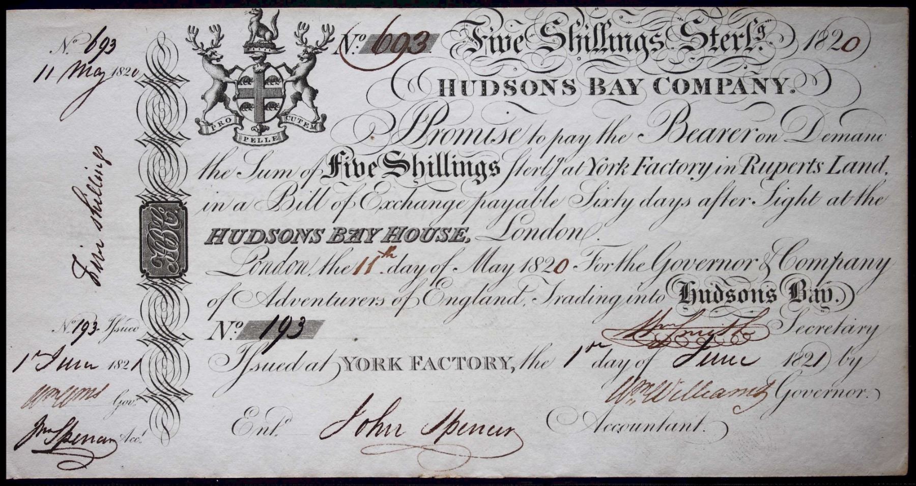 Hudson's Bay Company; 1820 Five Shillings Note #193. York Factory Issue. London Date: 11 May, 1820. York Date: 15 Nov., 1820.Secretary: Wm. Sm