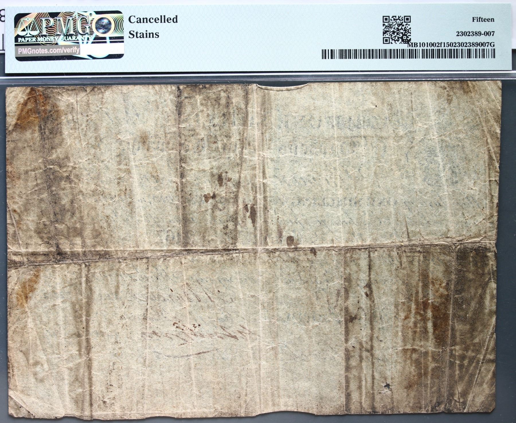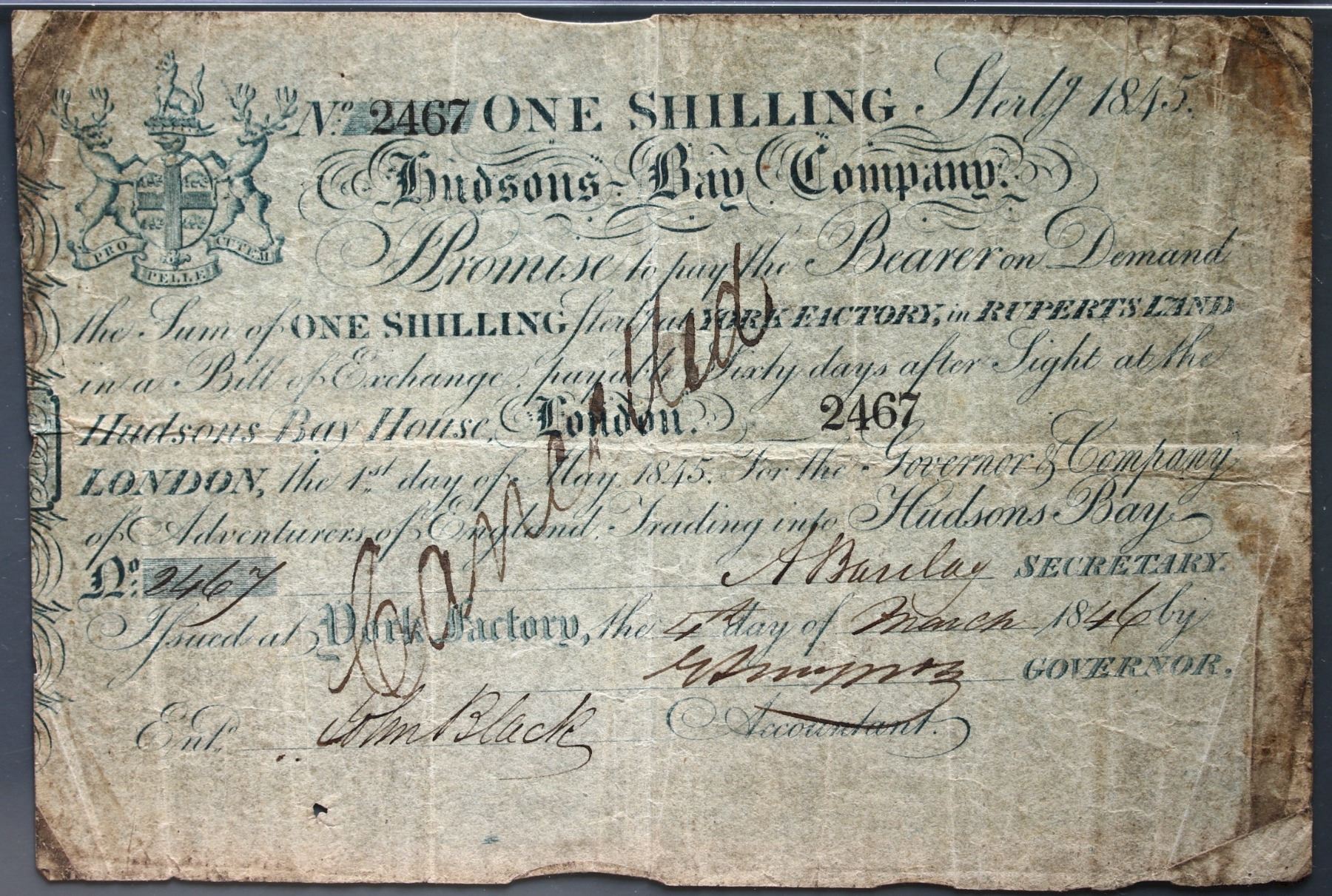 Hudson's Bay Company; 1846 One Shilling Note MB-10-10-02f #2467, PMG Choice Fine-15. These notes are highly important historical pieces and widely sought after by all types of collectors. This is cancelled example designated w/stains.