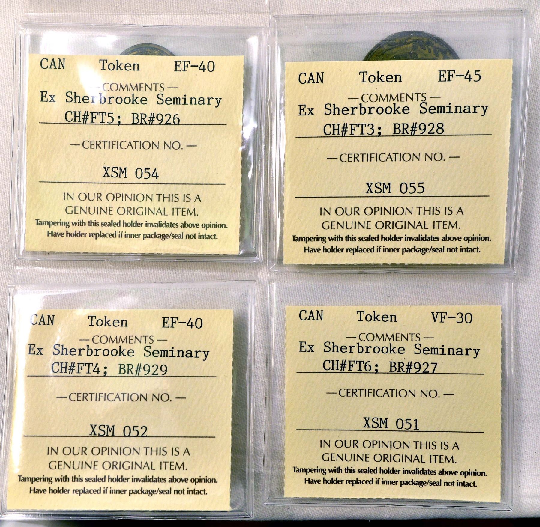 1) CH# FT5 Br 926 1 Made Beaver Punched for Moose Factory Certified ICCS EF-40 2) CH# FT6 Br 927 1/2 Made Beaver Punched for Moose Factory Certified ICCS VF-30 3) CH# FT3 Br 928 1/4 Made Beaver Unpunched, for Eastman Certified ICCS EF-45 4) CH# FT4 Br #929 1/8 Made Beaver Unpunched, for Eastman Certified ICCS EF-40
