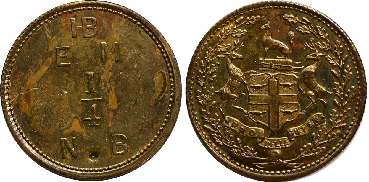 Hudson’s Bay; FT-7 Breton # 928, Gingras 220b brass AU/UNC - EM Moose Factory (Punched) (1857) 1/4 NB (Made Beaver)