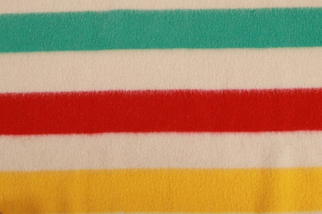 For your consideration is this Hudson's Bay four point wool trade blanket. The blanket shows a beautifully crafted wool construction to this blanket all done in a iconic Hudson's Bay design with four points along the side of the blanket. The number of points indicates the size of the blanket. Although the points did not originally assign a value to the blanket, over time, traders used the points to determine how many beaver pelts it could be traded for. At first, one point equaled one beaver pelt. By the early 1700s, the blankets represented more than half of the items traded for animal hides. The blanket shows a white background with different colored stripes of black, yellow, red and light blue. The four points are on one side of the the blanket. The tag can be found in the corner of the blanket. The condition of this blanket is good with some slight wear from its use and age but no signs of obvious damage are noted. The blanket measures 79 1/4" L x 62 1/4" W.