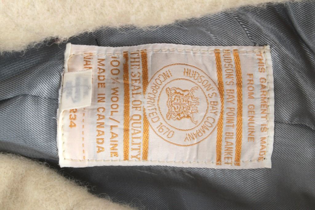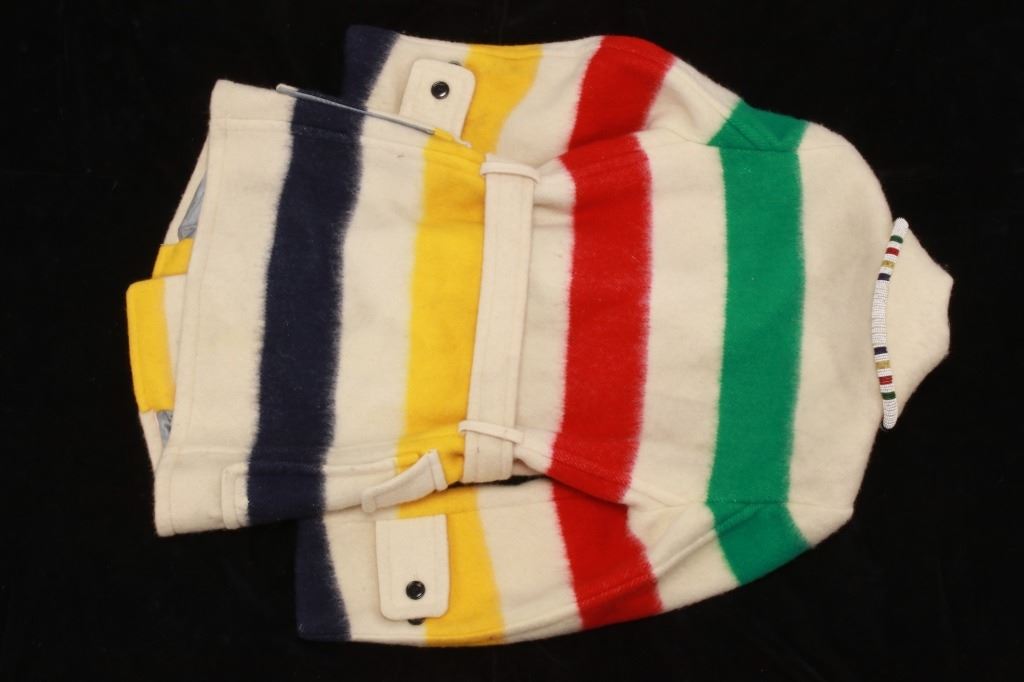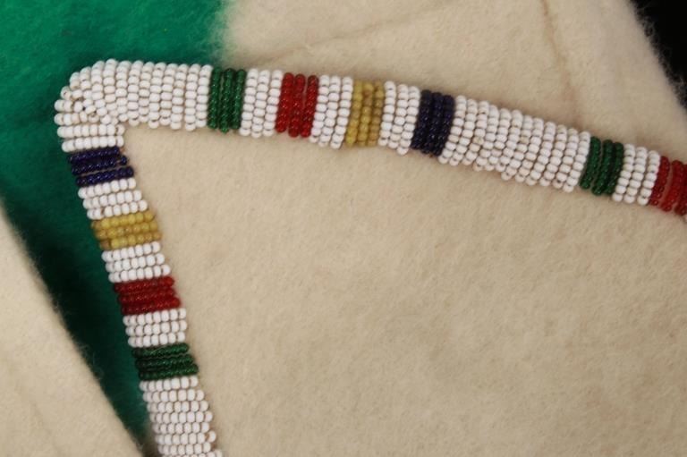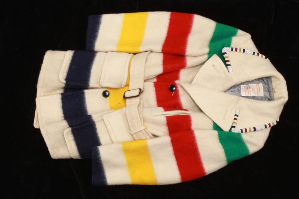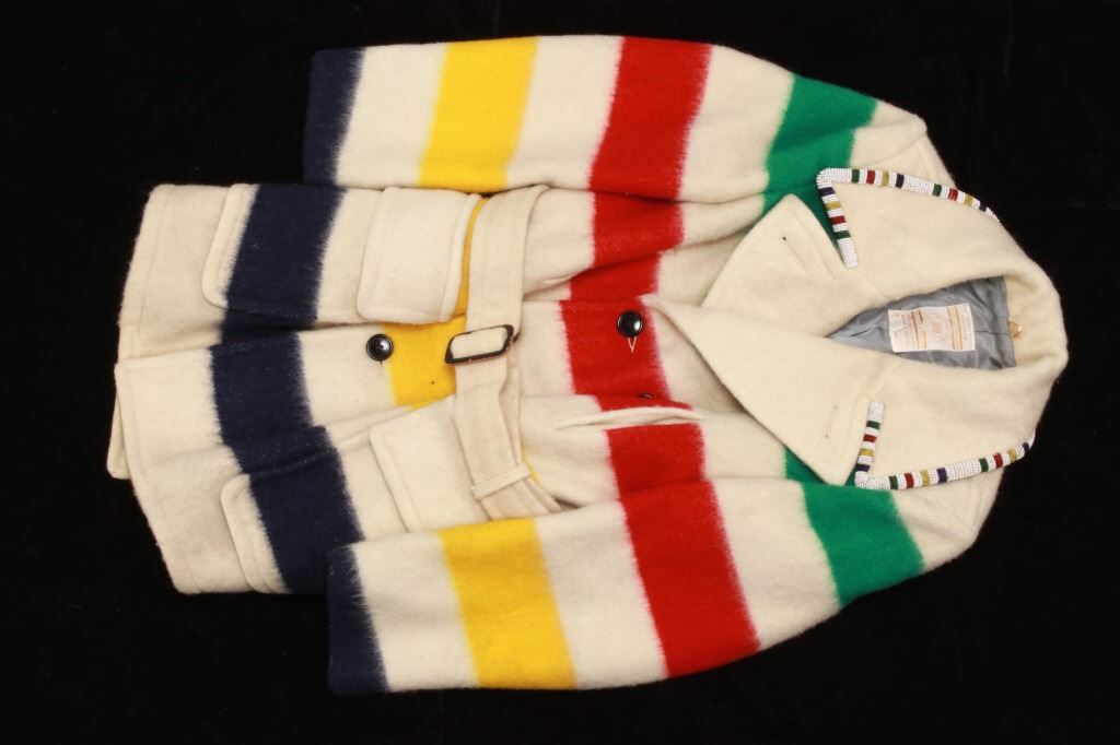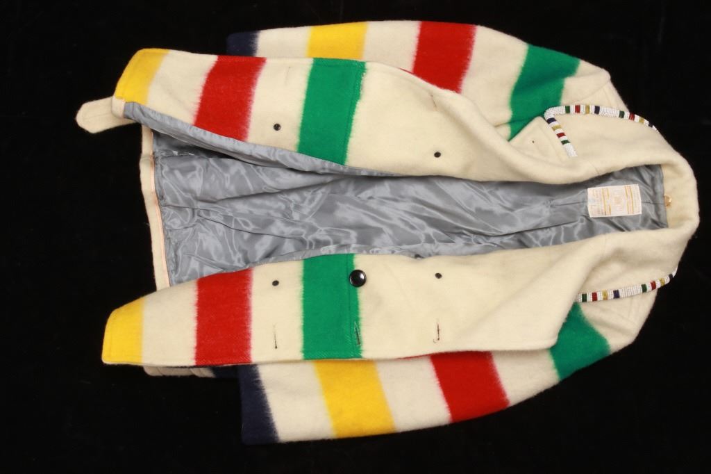 This is an original mid century Hudson’s Bay Company Point Blanket Coat / Jacket with beaded collar. The beadwork is likely Native American done, but a tribe is unknown. Hudson Bay blankets being used as coats dates back to circa mid-17th Century and were worn by First Nations and early Fur Traders, these types of jackets were known as Capote’s. Later “The Mackinaw” was born in 1811 when British Captain Charles Roberts at St. Joseph Island in the St. Mary’s River near Sault St. Marie could not procure winter gear from Quebec and instead ordered a supply of 3.5 point Hudson’s Bay Point Blankets and commissioned a group of local Indigenous women to make coats for his 40 men (from HBCHeritage.ca), later his men occupied American Fort Michilimackinac in Michigan as the War of 1812 began, ordering more jackets with shorter double breasted style becoming known as the Mackinaw. The first commercial jacket was introduced in 1922 and further in 1929 and later worn for the Canadian National Winter Olympic Games as a symbol of Canada in the 1960’s. This jacket likely dates to circa 1950-1970’s and has been further adorned with glass trade pony beads in the same white background with stripes in blue, yellow, red and green; in the same pattern of the iconic blanket (bead colors known as cobalt, greasy yellow, semi-transparent red and semi-transparent green). The jacket is a 3-point blanket with the points being found inside the blanket under the right arm-pit. The piece has a belt with leather wrapped metal buckle with double large buttons with large collar, large pockets and smaller integral pockets just above. The inside has the original tag which reads, “This Garment Is Made From Genuine / Hudson’s Bay Point Blanket / Hudson’s Bay Company Incorporated 1670 (the company logo) / The Seal Of Quality / 100% Wool / Laine / Made In Canada / Name _____ / CA00234” with a smaller tag that reads, “DRY CLEAN ONLY” and above a small tag that reads, “HB10 38 (then hand written 28 maybe?) HB7269”. The coat appears to be in a good condition for its age with little to no loss the fabric, near original condition being well preserved. The buckle has wear. The jacket has a good soft well preserved material and good smell. When the buttons are closed and the jacket is laid as it is photographed the piece measures 40”L by 38.5”W. The shoulders appear to be 19”W from the seem to seem (not including the arms). The tag denotes a 38 size but size is unknown.