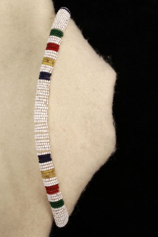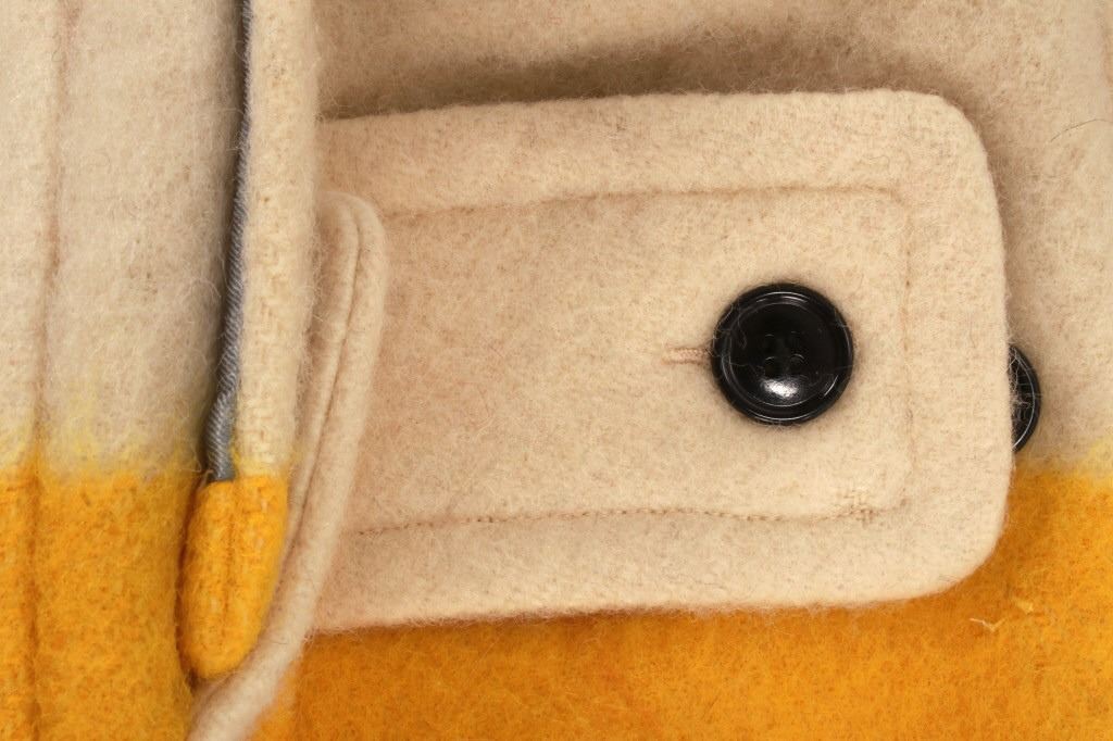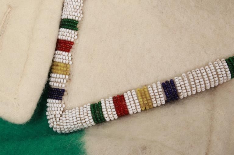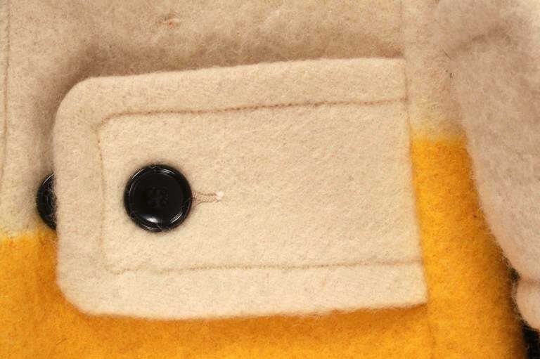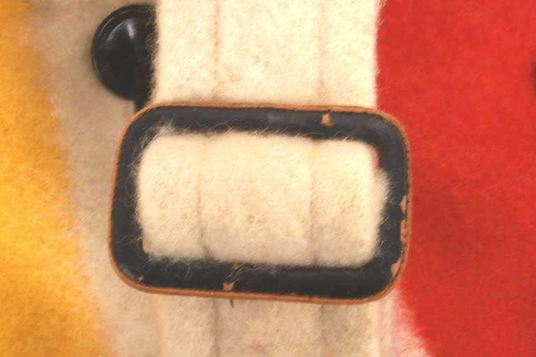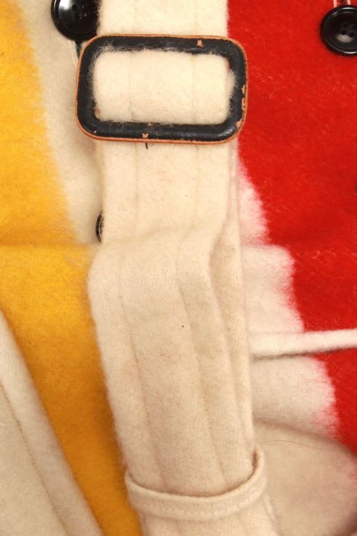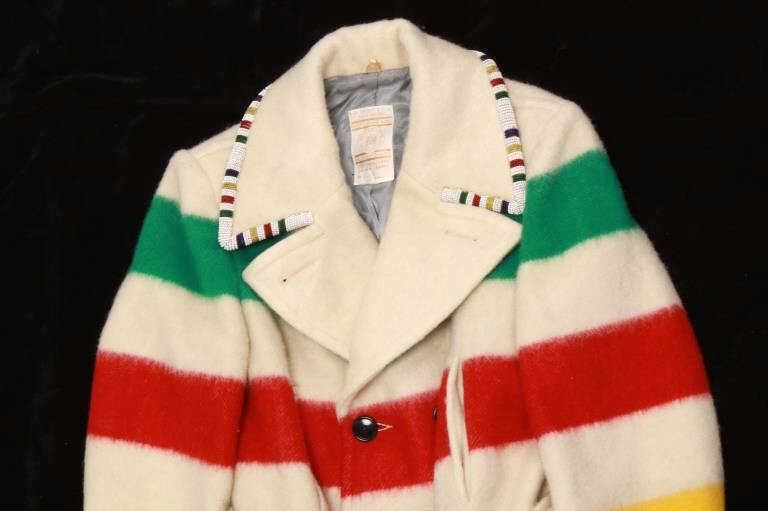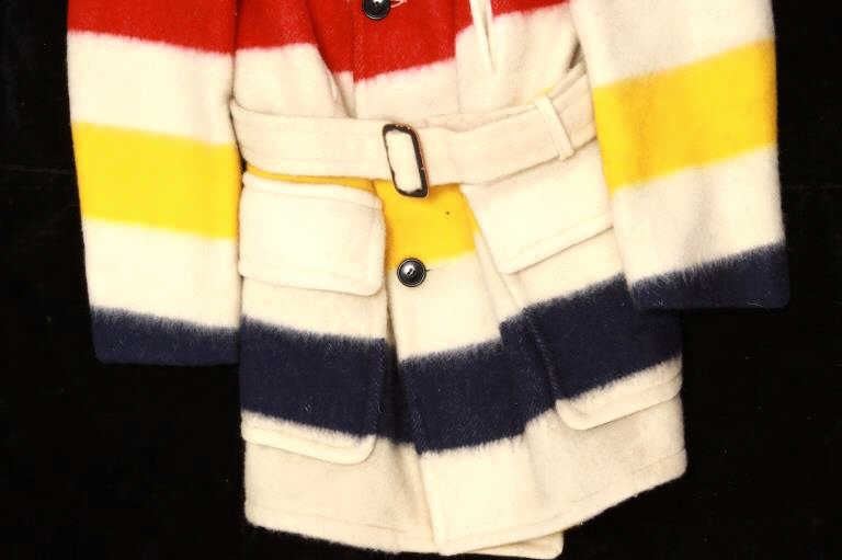 This is an original mid century Hudson’s Bay Company Point Blanket Coat / Jacket with beaded collar. The beadwork is likely Native American done, but a tribe is unknown. Hudson Bay blankets being used as coats dates back to circa mid-17th Century and were worn by First Nations and early Fur Traders, these types of jackets were known as Capote’s. Later “The Mackinaw” was born in 1811 when British Captain Charles Roberts at St. Joseph Island in the St. Mary’s River near Sault St. Marie could not procure winter gear from Quebec and instead ordered a supply of 3.5 point Hudson’s Bay Point Blankets and commissioned a group of local Indigenous women to make coats for his 40 men (from HBCHeritage.ca), later his men occupied American Fort Michilimackinac in Michigan as the War of 1812 began, ordering more jackets with shorter double breasted style becoming known as the Mackinaw. The first commercial jacket was introduced in 1922 and further in 1929 and later worn for the Canadian National Winter Olympic Games as a symbol of Canada in the 1960’s. This jacket likely dates to circa 1950-1970’s and has been further adorned with glass trade pony beads in the same white background with stripes in blue, yellow, red and green; in the same pattern of the iconic blanket (bead colors known as cobalt, greasy yellow, semi-transparent red and semi-transparent green). The jacket is a 3-point blanket with the points being found inside the blanket under the right arm-pit. The piece has a belt with leather wrapped metal buckle with double large buttons with large collar, large pockets and smaller integral pockets just above. The inside has the original tag which reads, “This Garment Is Made From Genuine / Hudson’s Bay Point Blanket / Hudson’s Bay Company Incorporated 1670 (the company logo) / The Seal Of Quality / 100% Wool / Laine / Made In Canada / Name _____ / CA00234” with a smaller tag that reads, “DRY CLEAN ONLY” and above a small tag that reads, “HB10 38 (then hand written 28 maybe?) HB7269”. The coat appears to be in a good condition for its age with little to no loss the fabric, near original condition being well preserved. The buckle has wear. The jacket has a good soft well preserved material and good smell. When the buttons are closed and the jacket is laid as it is photographed the piece measures 40”L by 38.5”W. The shoulders appear to be 19”W from the seem to seem (not including the arms). The tag denotes a 38 size but size is unknown.