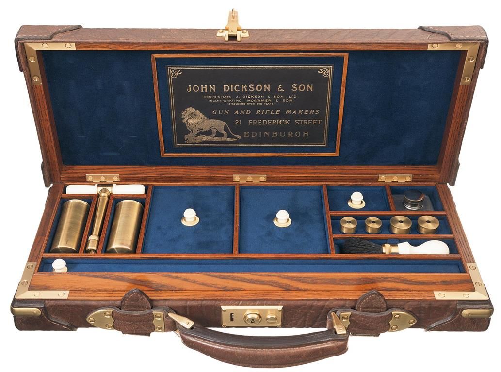 1) Marvin C. Huey Jr. custom cased shotgun cleaning and accessory kit. The case is marked in part on the inside of the lid " JOHN DICKSON & SON/GUN AND RIFLE MAKERS/21 FREDERICK STREET/EDINBURGH" and includes the following: One solid brass two piece cleaning rod with ivory handle and two brass pointed jags, one ivory and brass handled brush, two brass cased bronze bore brushes, two uncased bronze bore brushes, three oilers (2 brass, 1 glass) and four brass and plastic snap caps ( 2 - 12 gauge and 2 - 28 gauge). 2) Marvin C. Huey Jr. six compartment custom shot shell case. Both Huey cases are finished hardwood, leather covered with brass hardware and velvet linings. 3) One hardwood four compartment case with brass hardware. This case is placarded "MICHAEL McINTOSH", who was a firearms author who wrote for Shooting Sportsman and wrote the book AH Fox as well as other shotgun books.