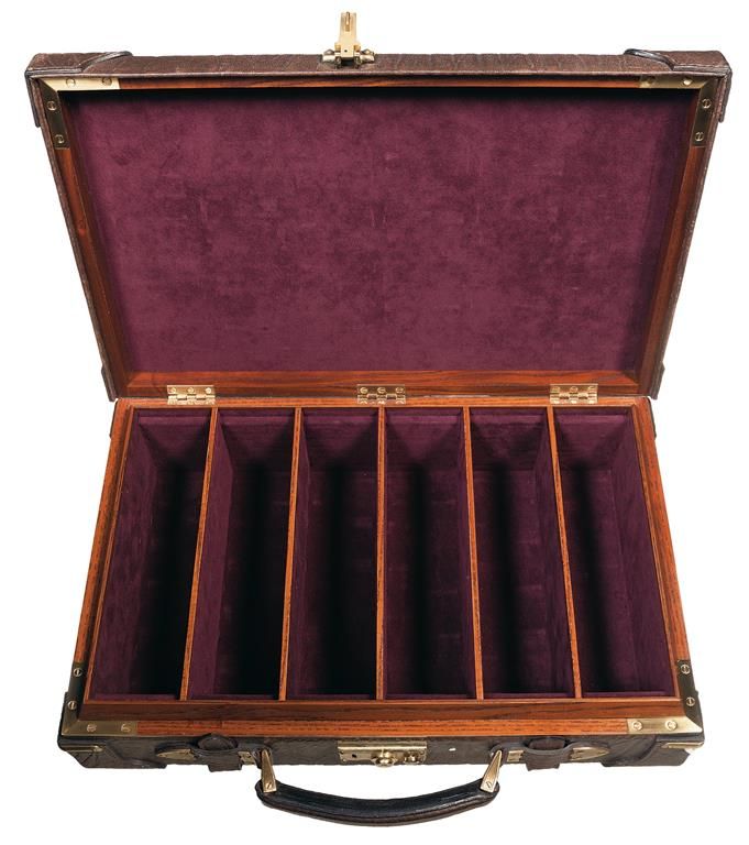 1) Excellent with a few light edge and corner marks. The lining shows very light wear and the brass is slightly darkened with age. The cleaning kit components and accessories are excellent. 2) Excellent with a few light edge and corner marks. The lining shows very light wear and the brass is slightly darkened with age. 3) Very good with edge, corner and handling marks.