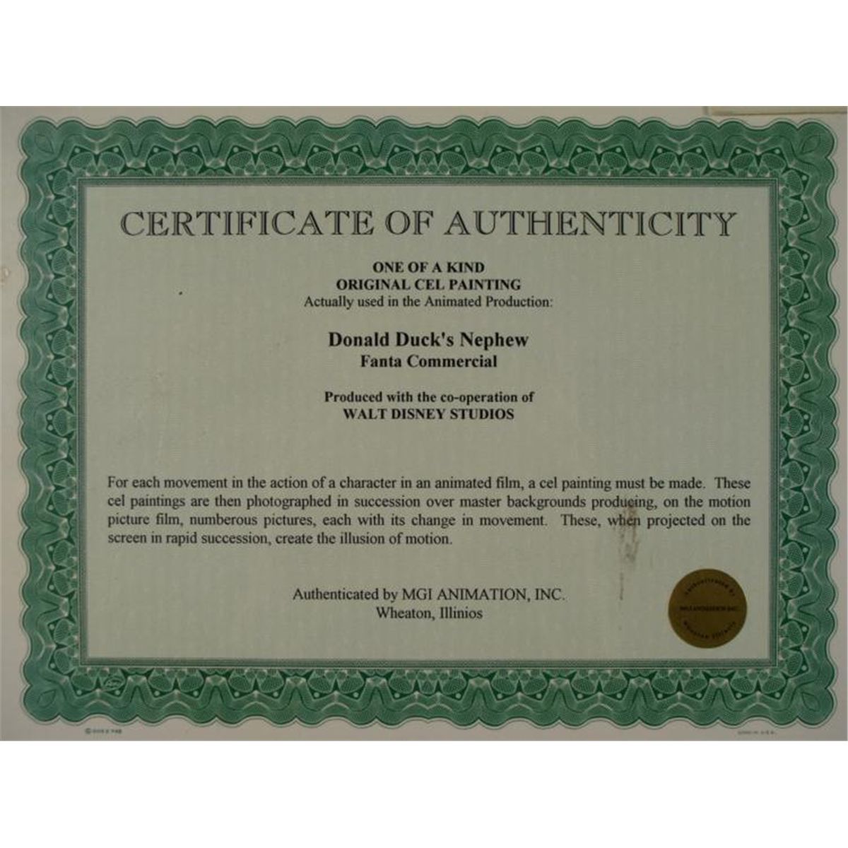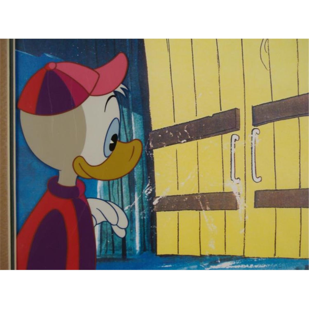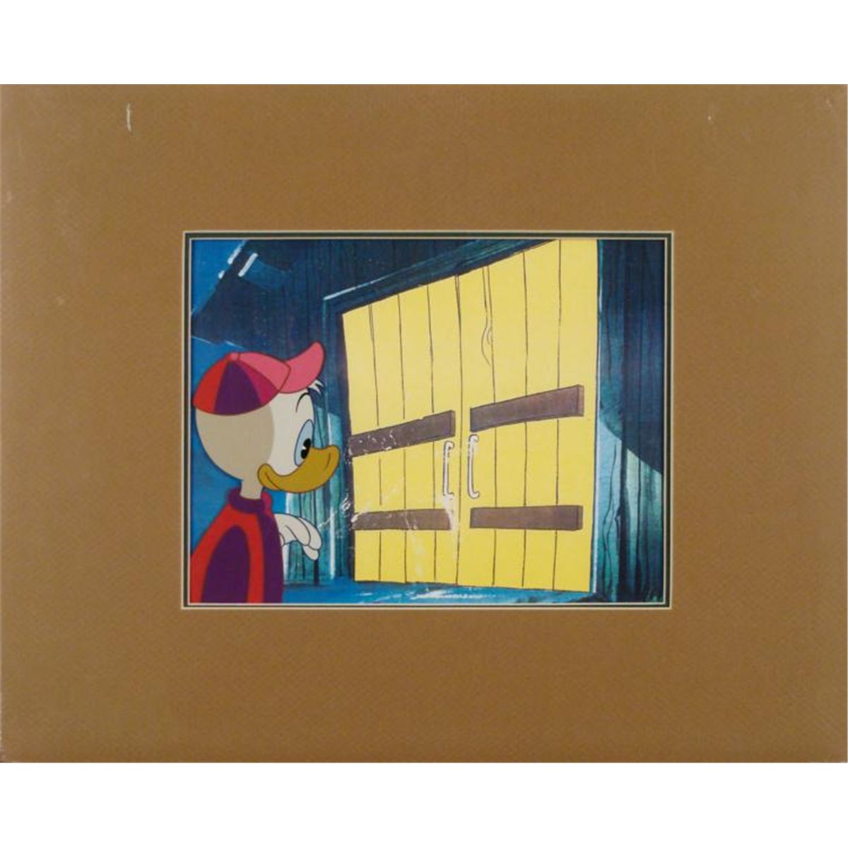 This is an original animation cel used in the production of a 1980's Fanta soda commercial. It was produced in conjunction with Walt Disney studios. Here is Donald Duck's nephew Huey ready to open the door to the ship's cabin, looking for a Fanta! * Medium: Hand-inked and hand-painted acetate cel with printed backgroundImage size: 11 x 8 1/2 inchesPresentation: Double matted in brown and grayMatte size: 20 x 16 inchesCondition: Excellent; sealed in cellophaneCertificate of Authenticity: Included