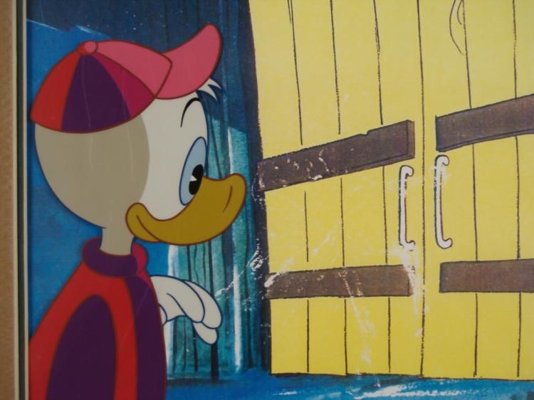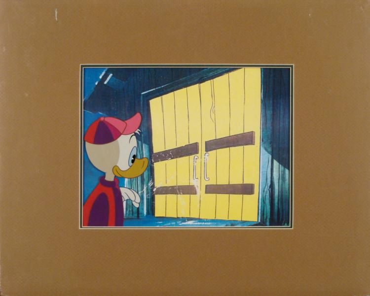 This is an original animation cel used in the production of a 1980's Fanta soda commercial. It was produced in conjunction with Walt Disney studios. Here is Donald Duck's nephew Huey ready to open the door to the ship's cabin, looking for a Fanta! * Medium: Hand-inked and hand-painted acetate cel with printed backgroundImage size: 11 x 8 1/2 inchesPresentation: Double matted in brown and grayMatte size: 20 x 16 inchesCondition: Excellent; sealed in cellophaneCertificate of Authenticity: Included