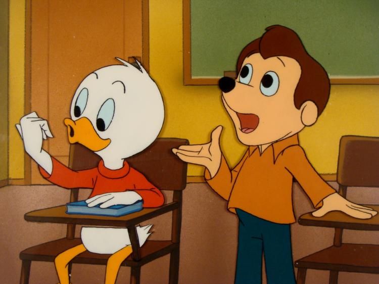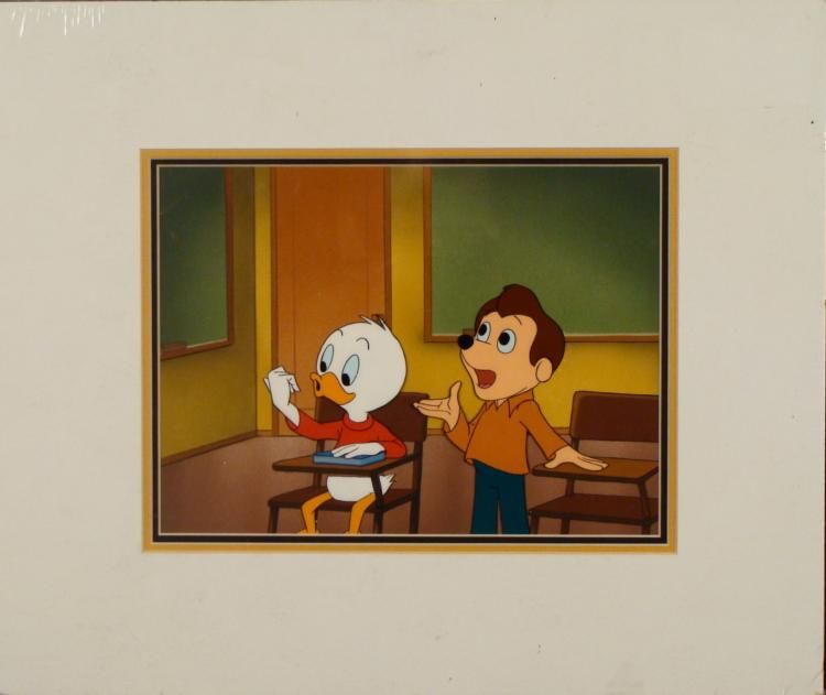 Here is an original animation cel used in the production of a Disney educational cartoon. This is Donald's nephew Huey sitting in class, along with a friend. This appears to be an older cel that may date back to the 1970's or earlier. * Medium: Hand-inked and hand-painted acetate cel, with production backgroundImage size: 11 1/4 x 8 1/4 inches Presentation: Triple matted in black, white, and yellowMatte size: 16 x 19 inchesCondition: Excellent; sealed in cellophaneCertificate of Authenticity: Included