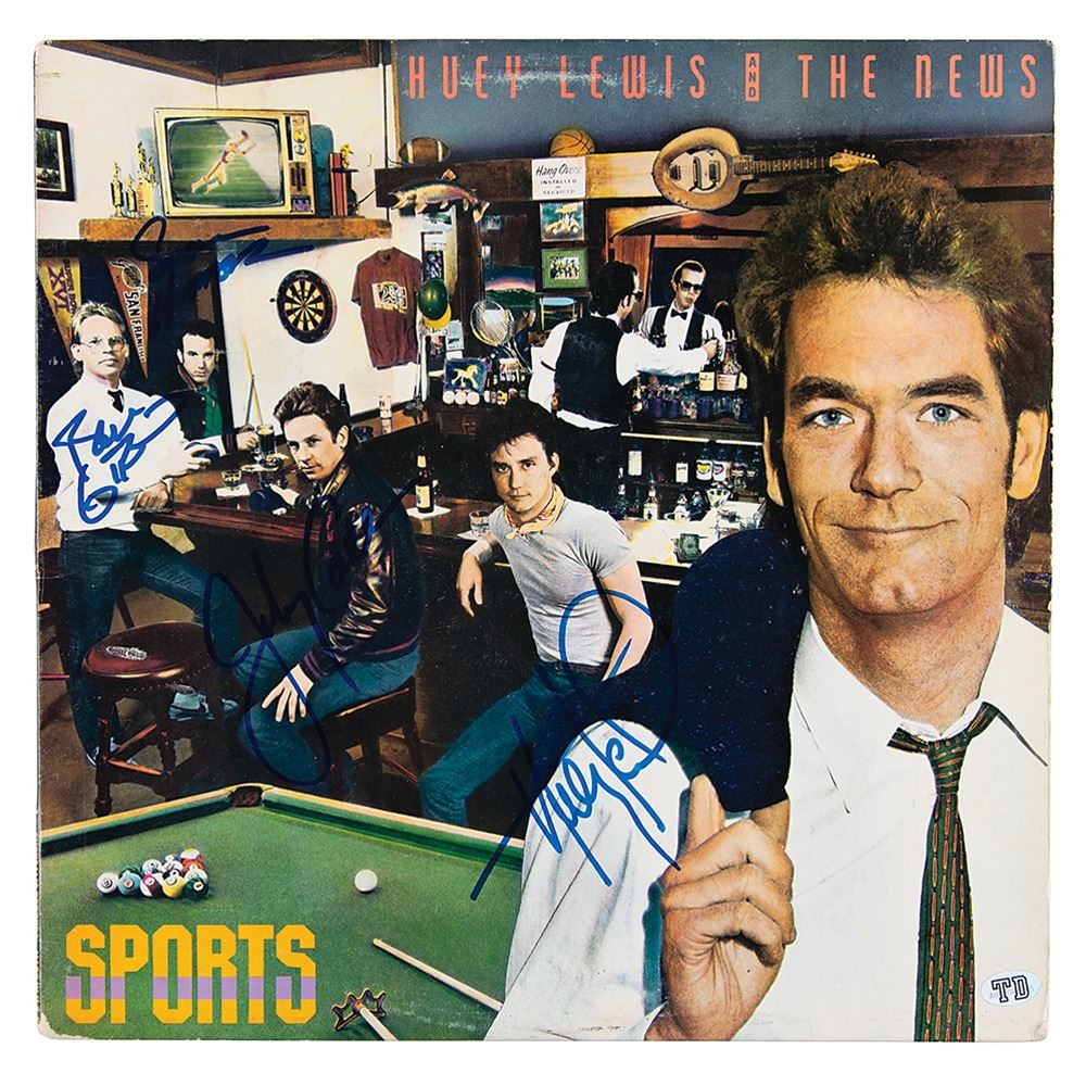 Sports album signed on the front cover in blue felt tip by Huey Lewis, Bill Gibson, Johnny Cola, and Sean Hopper. In fine condition. The record is included.