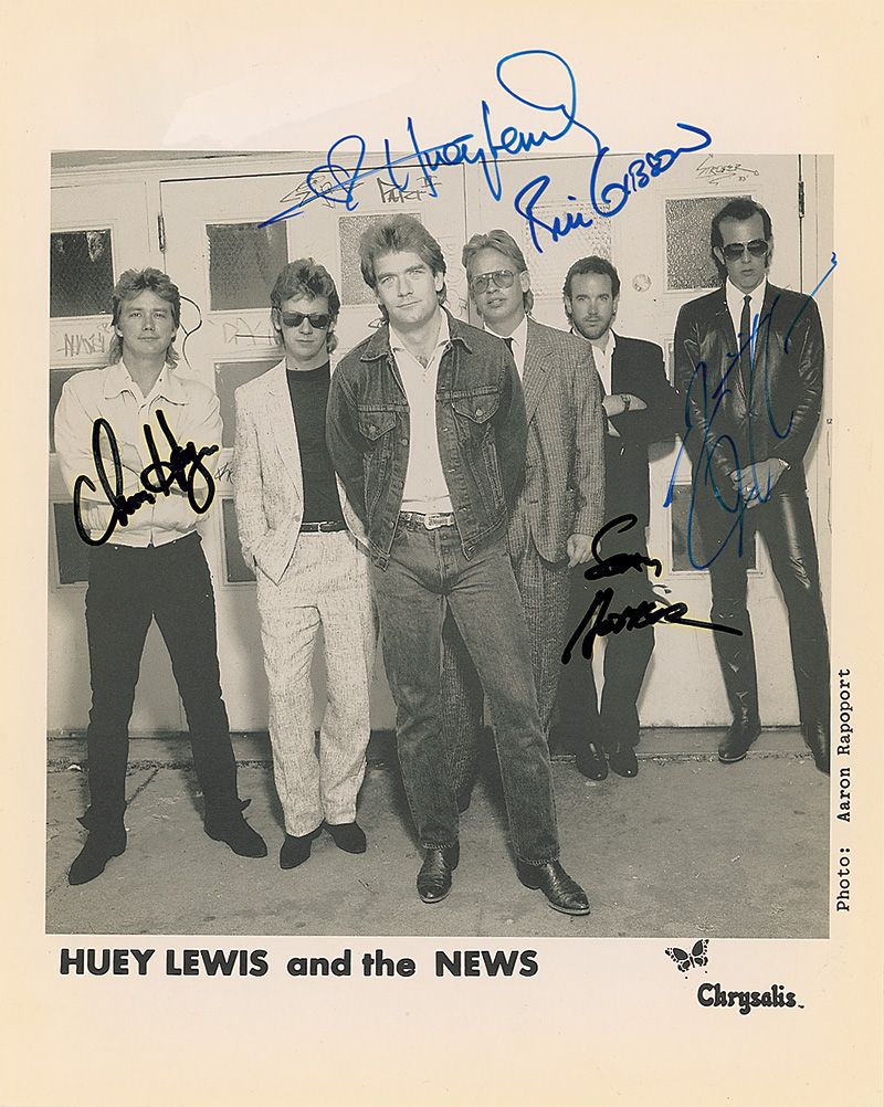 Glossy 8 x 10 Chrysalis Records publicity photo, signed in blue and black felt tip by Chris Hayes, Huey Lewis, Bill Gibson, Stef Burns, and Johnny Colla. Toning to the borders, a paperclip impression to the top edge, some rubbing to the finish, and some haloing to the Hayes and Burns signatures, otherwise fine condition.