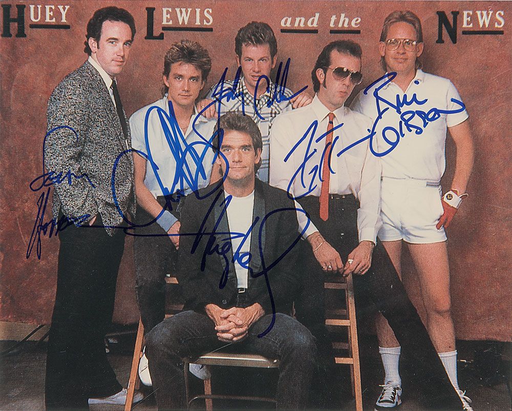 Color glossy 10 x 8 group photo, signed in person in blue felt tip by Huey Lewis, Sean Hopper, Johnny Colla, Chris Hayes, Mario Cipollina, and Bill Gibson. In very fine condition. Originally obtained by in-person specialist Mike Wehrmann.