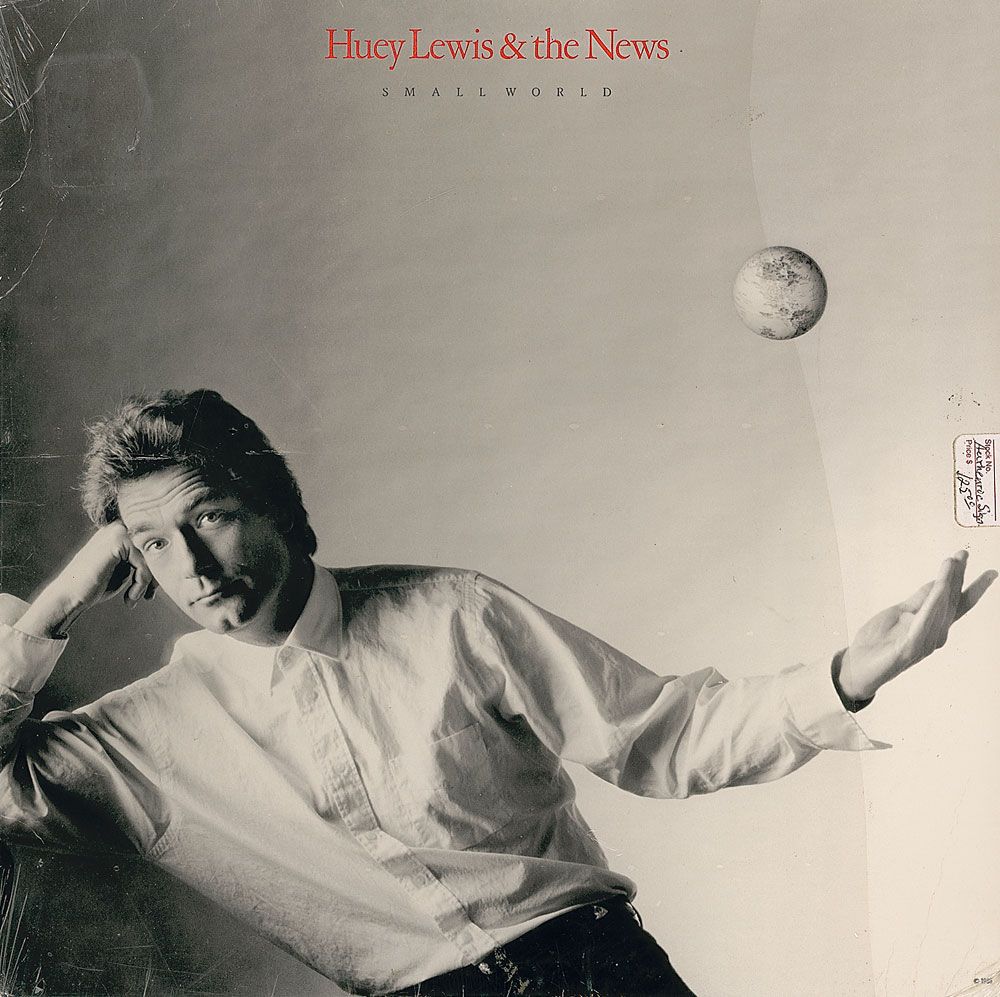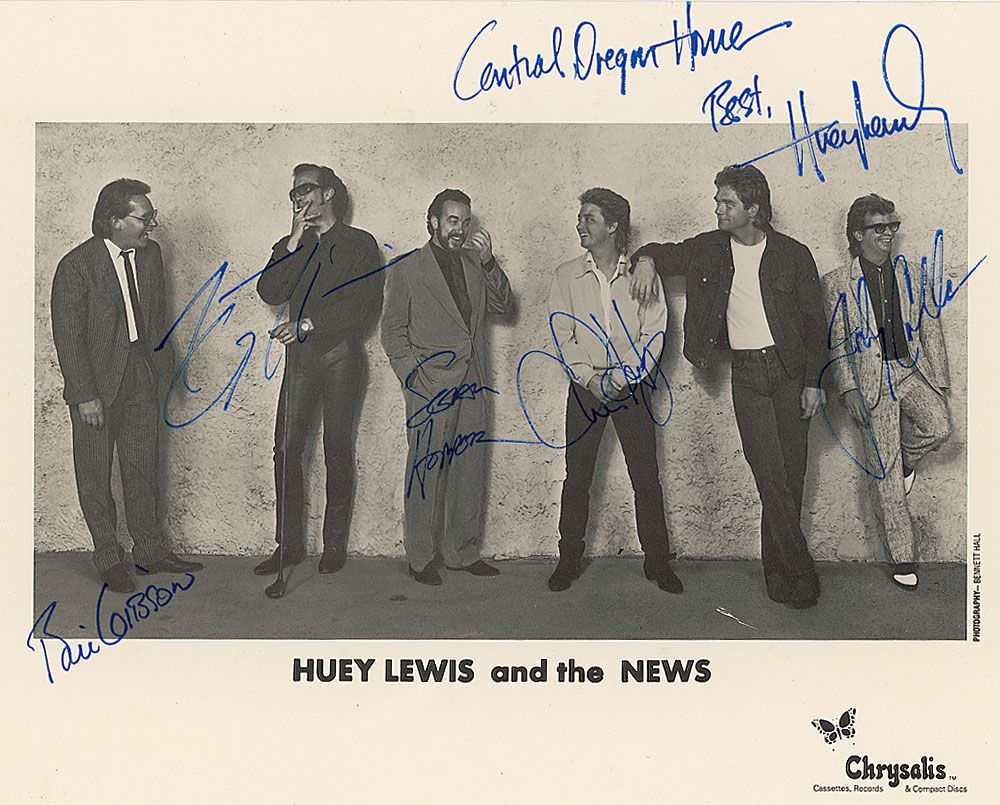 Glossy 10 x 8 Chrysalis Records publicity photo, signed in blue felt tip by Huey Lewis, Sean Hopper, Johnny Colla, Chris Hayes, Mario Cipollina, and Bill Gibson, with Lewis adding an inscription to “Central Oregon Home.” In fine condition. Accompanied by an unsigned Small World album.