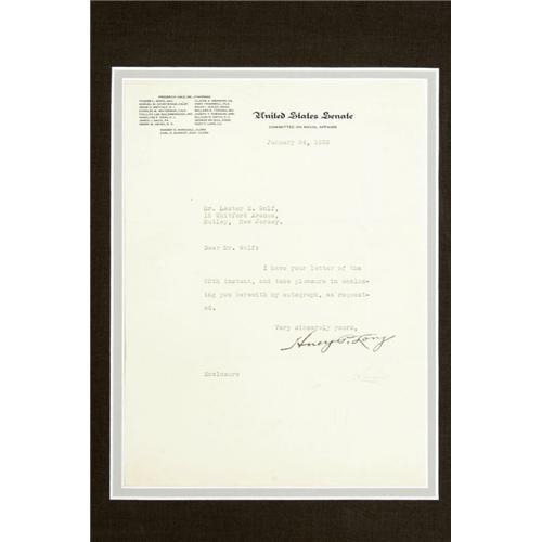 <B>Huey P. Long Typed Letter Signed as U.S. Senator From Louisiana.</B></I> One page, 7.5" x 10.25", U.S. Senate letterhead, January 24, 1932, to Lester E. Wolf, Nutly, New Jersey. Louisiana's most notorious political boss of the 20th century indulges an autograph seeker with this short letter. Light folds, Fine condition. Framed to 23.5" x 17.5" with a black and white photograph of Long glancing up from a newspaper. <BR><BR><B>Important notice:<