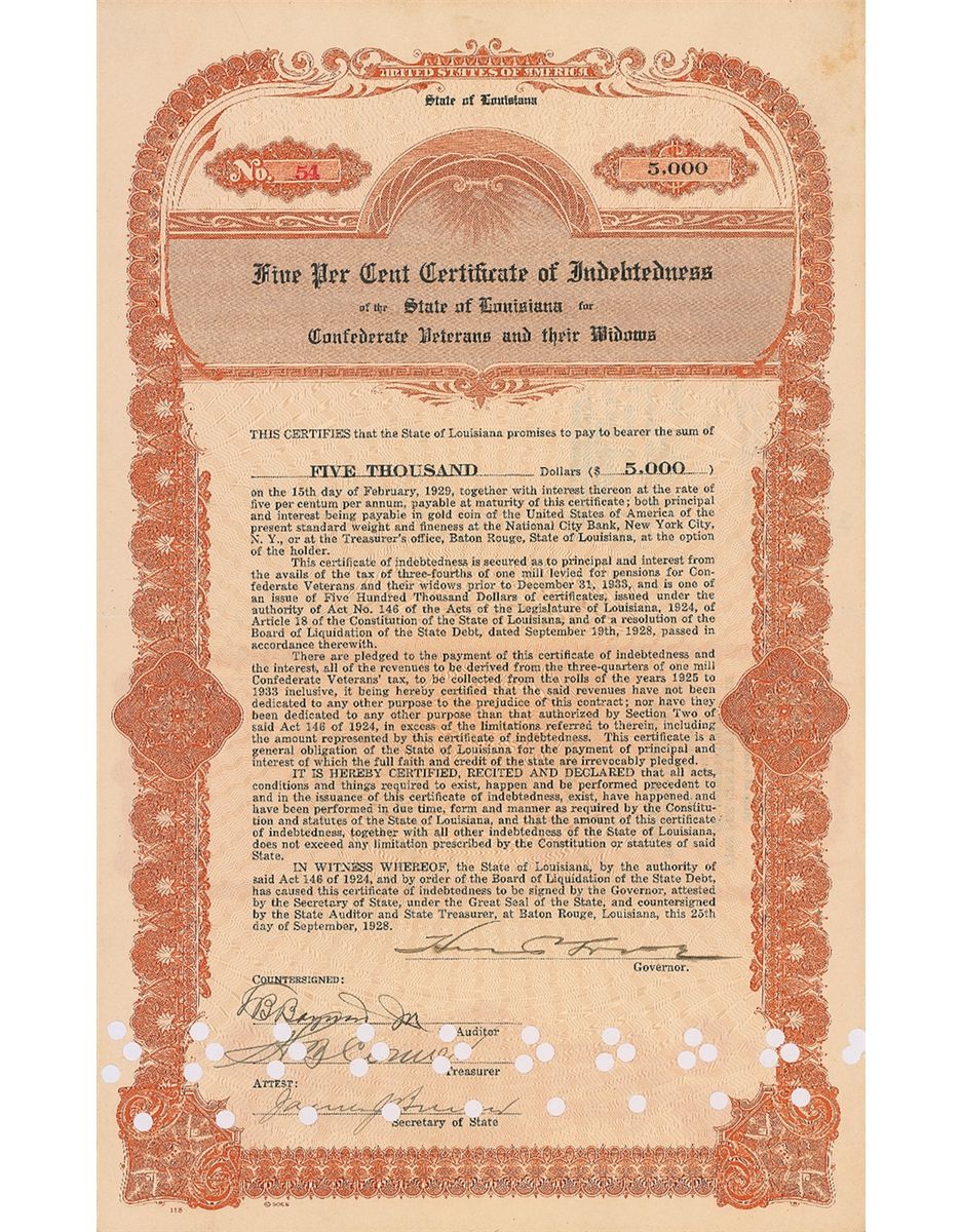 DS, signed “Huey P. Long,” one page both sides, 9.5 x 15, September 25, 1928. A $5000 “Certificate of Indebtedness of the State of Louisiana for Confederate Veterans and their Widows.” In part: “This certifies that the State of Louisiana promises to pay to bearer the sum of Five Thousand Dollars ($5,000) on the 15th day of February, 1929, together with interest thereon at the rate of five per centime annum, payable at maturity of this certificate; both principal and interest being payable in gold coin of the United States of America of the present standard weight and fineness." In fine condition, with one horizontal fold and two horizontal creases, one affecting the top of signature, mild uniform toning, foxing to upper right corner, cancellation holes to bottom, and some spreading to signature. An interesting link between Long’s populist policies and the men who fought against progressive reform in the century prior.