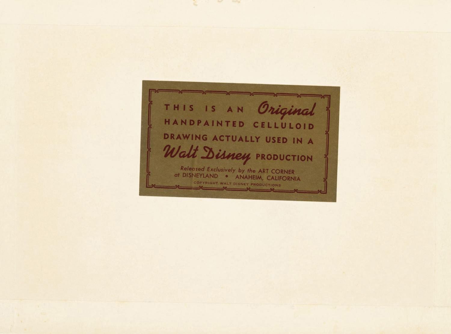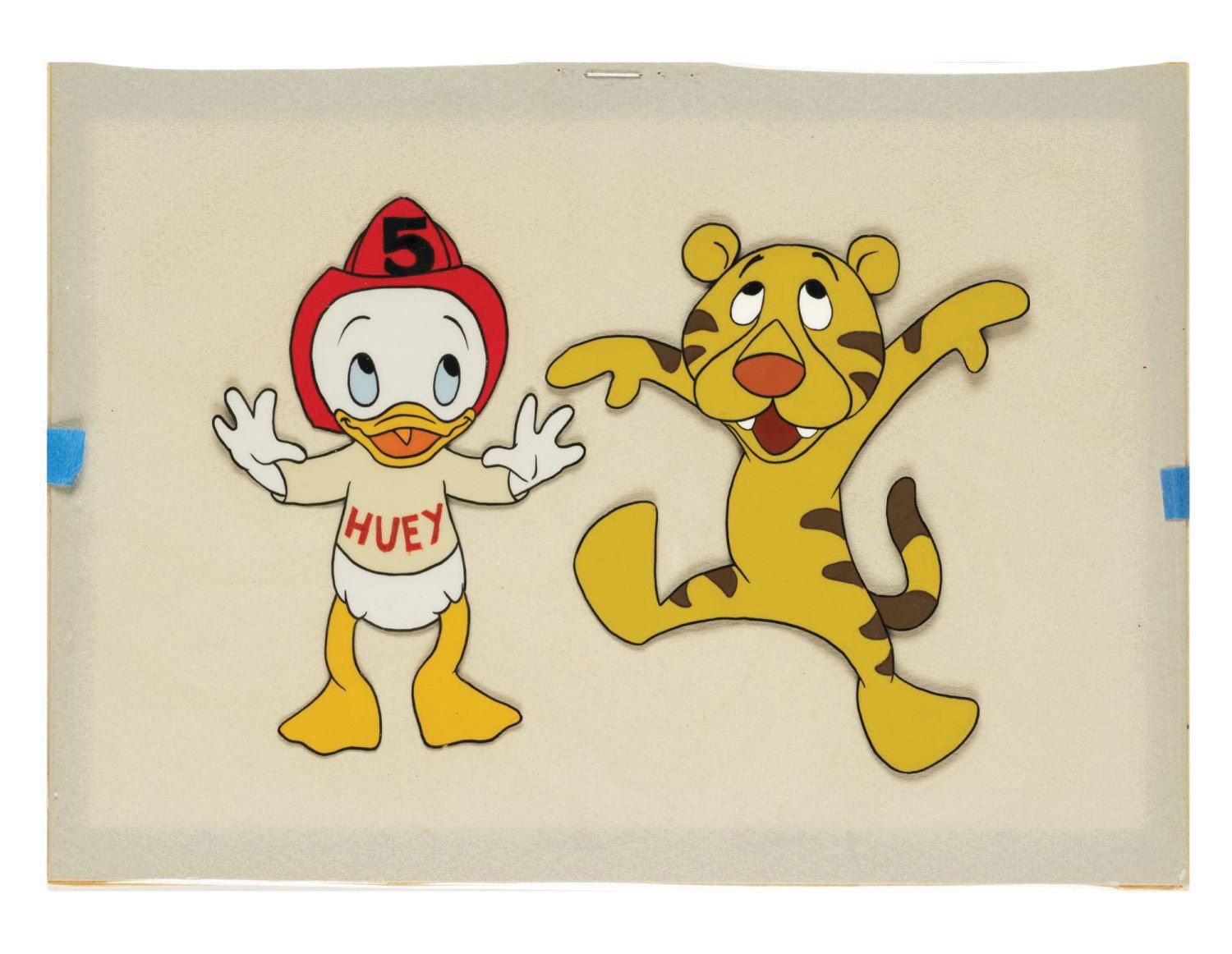 (Disney, c.1950s-60s) A production cel set-up featuring Huey and a tiger. The cels were trimmed and assembled for sale at the Disneyland Art Corner. The piece has a combined painted character size of 5"x7.25" on the 7.5"x10" cel sheets. The set-up displays in very good condition, exhibiting minimal wear, and retaining the Art Corner label on the reverse.