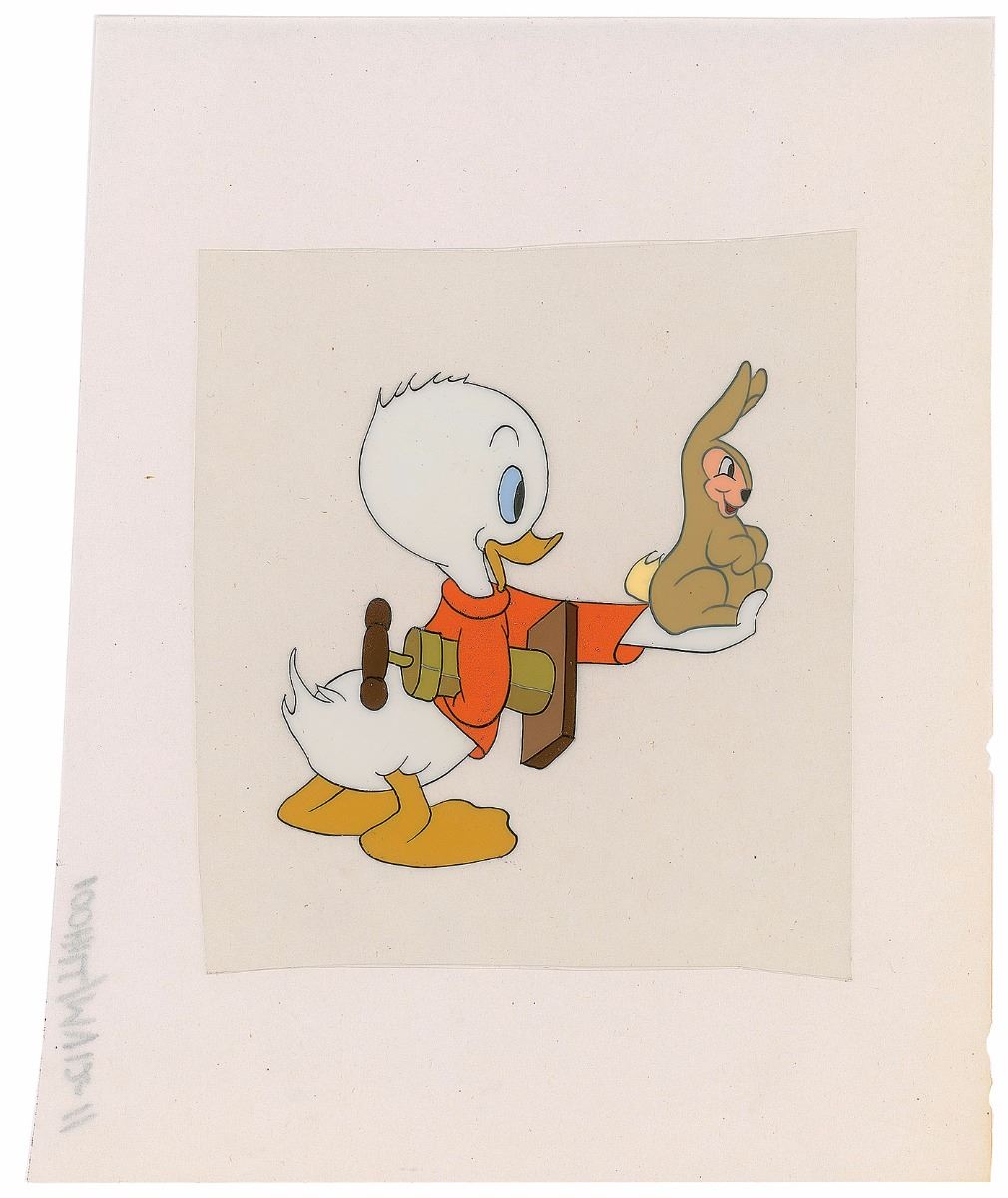 (Walt Disney Studios, 1944) Original production cel featuring Huey from Donald’s Off Day, showing the duckling with a hand pump and holding a small rabbit. The cel is trimmed to 4 x 4.25. Total image measures 3 x 3. In fine condition.