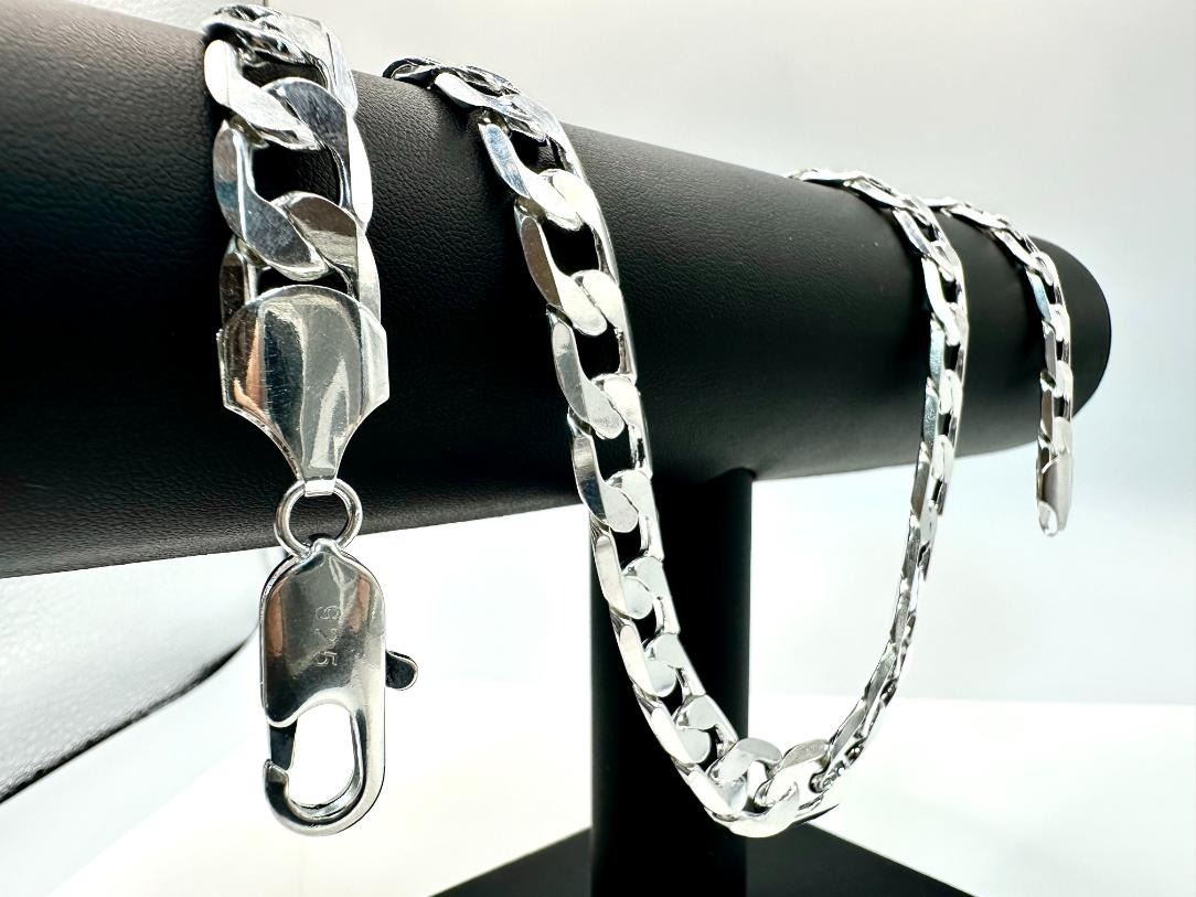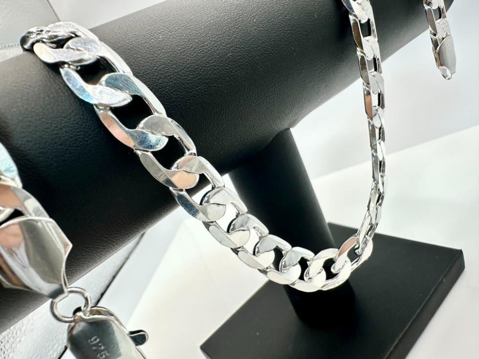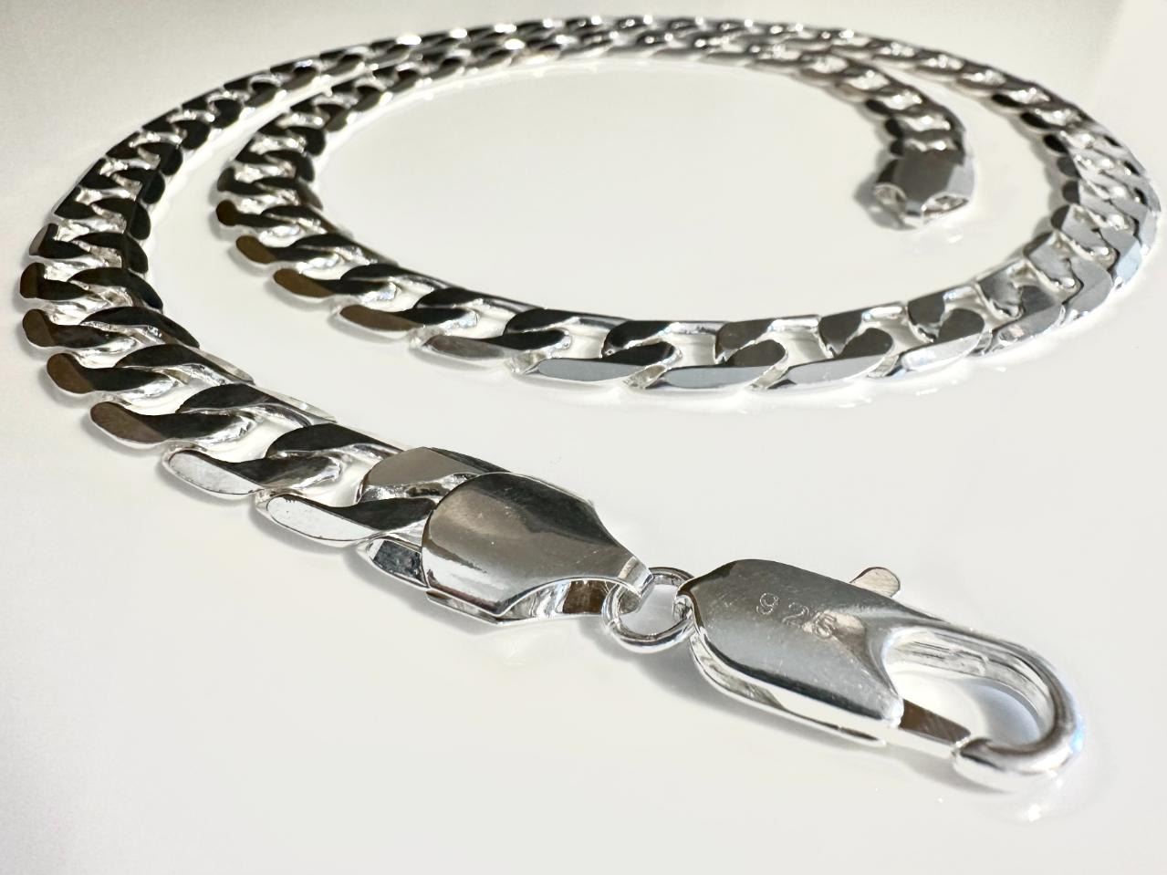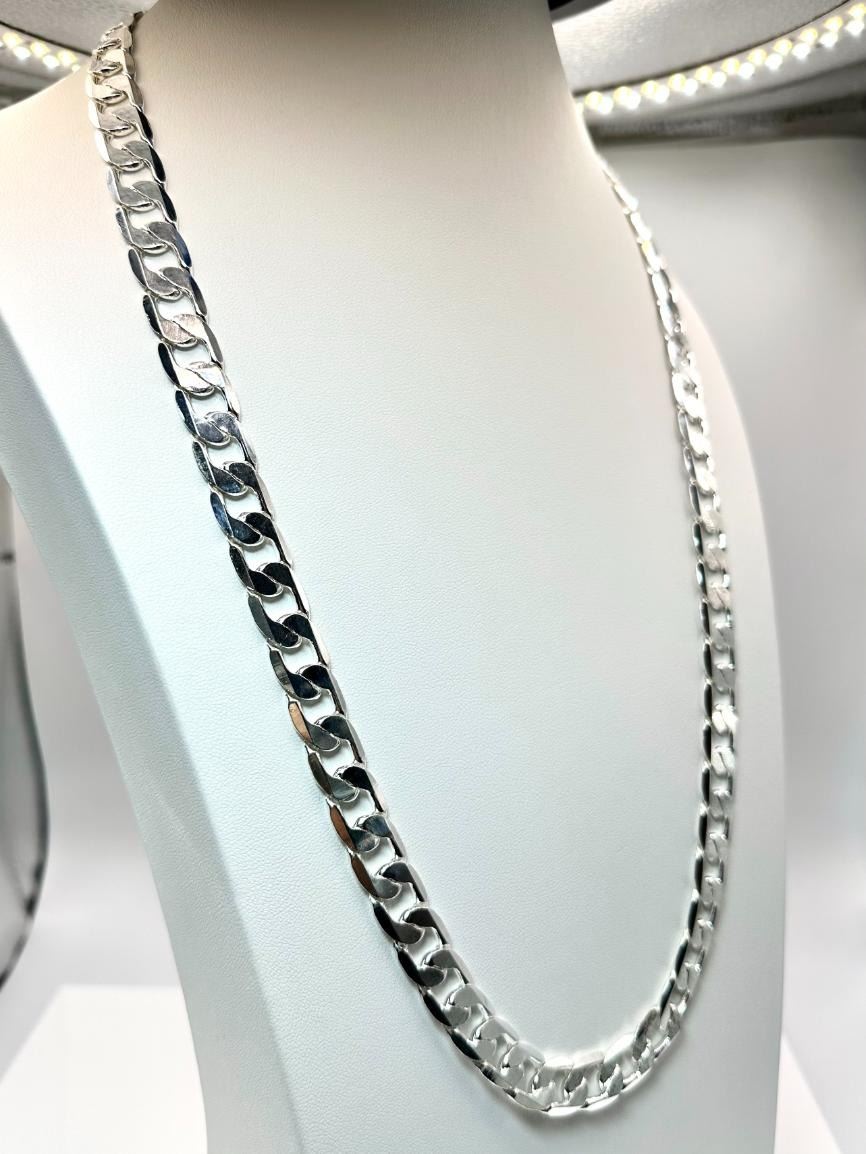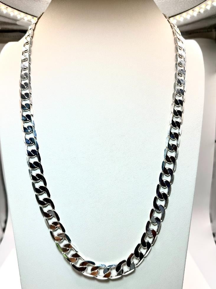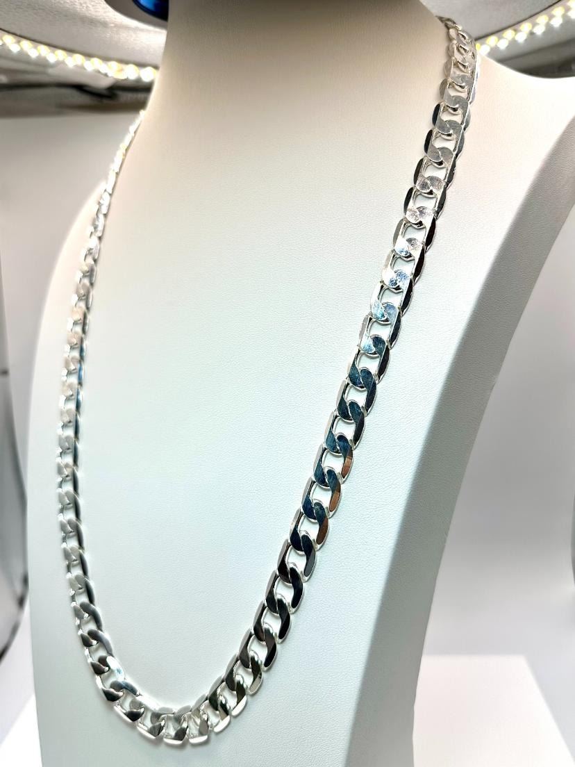 Huge 102 Gram .925 Sterling Silver Flat Cuban Link Chain Necklace. This Fine Silver Necklace Is a Fine Solid Diamond Cut. This necklace measures 30 inches long and a healthy 12 mm. thick. This high-quality silver necklace looks and feels like solid silver without the extra price. This necklace is extremely well made.