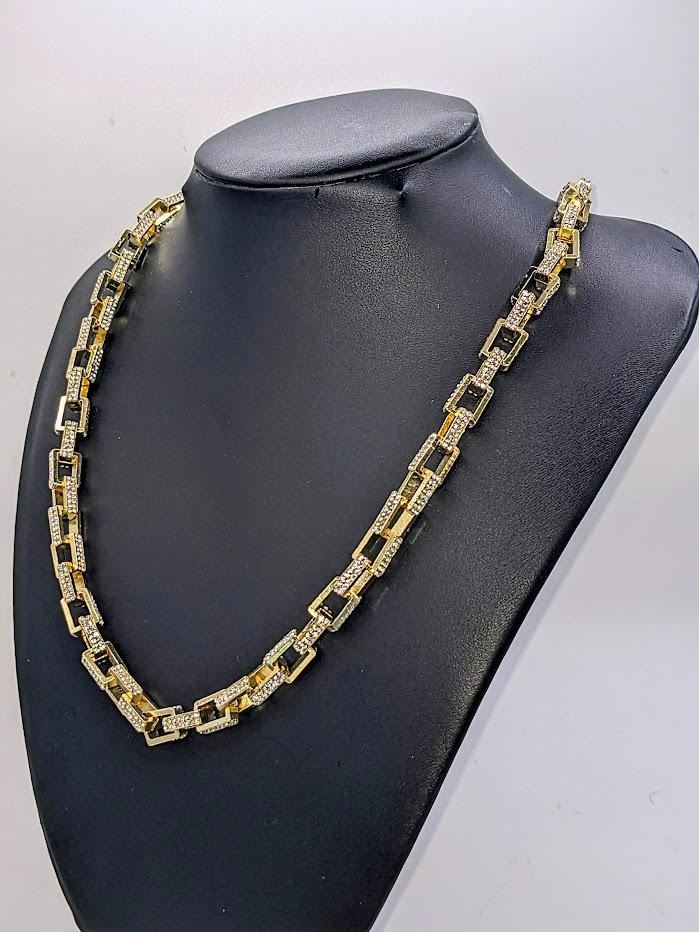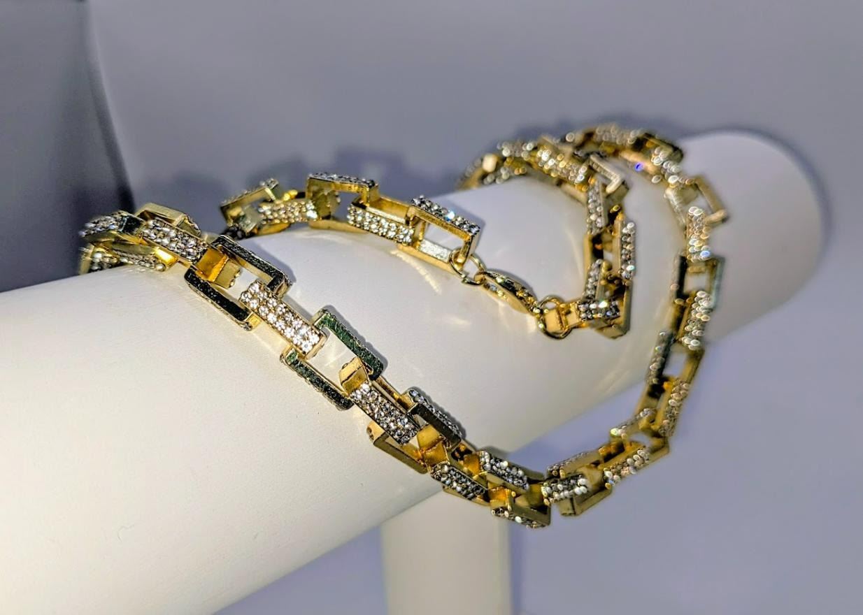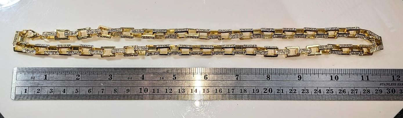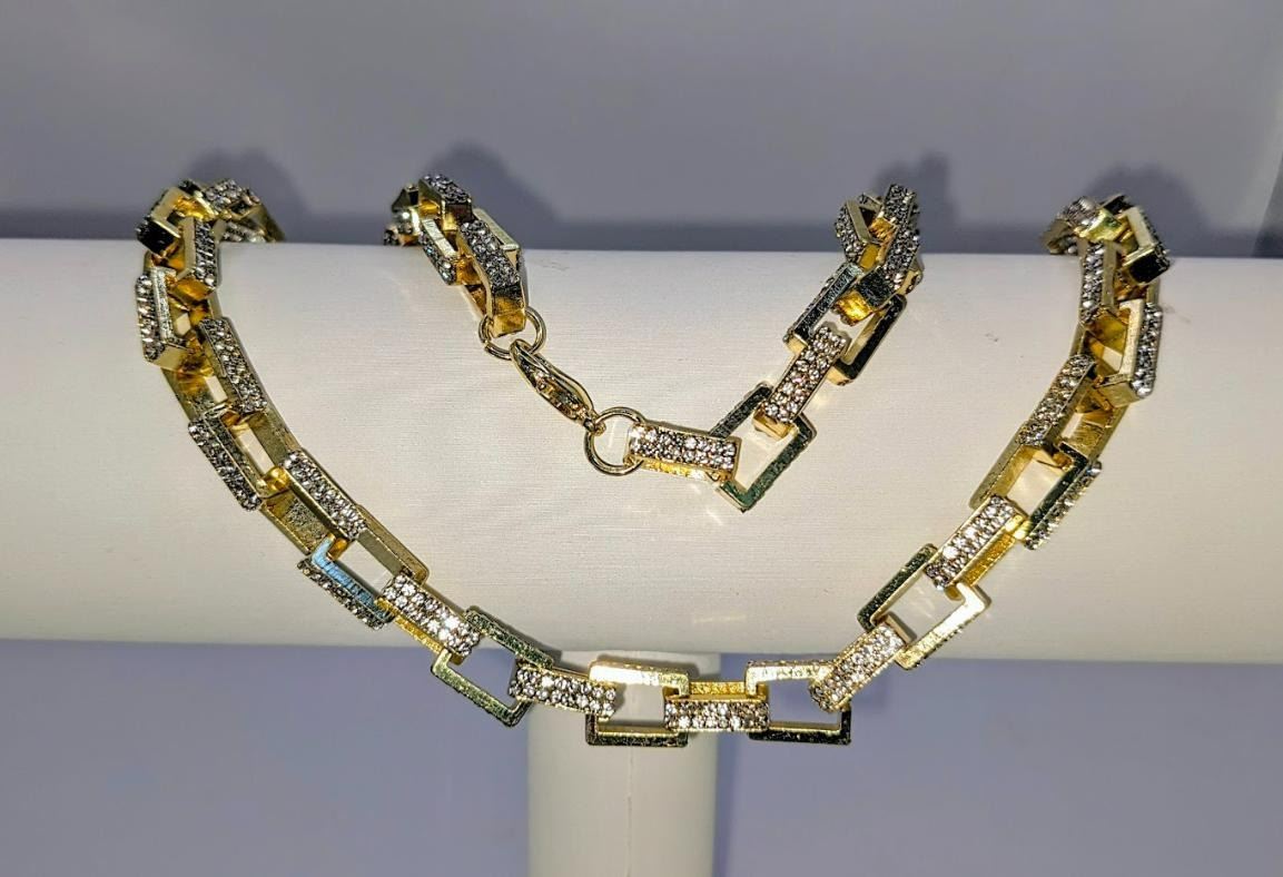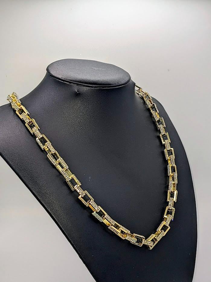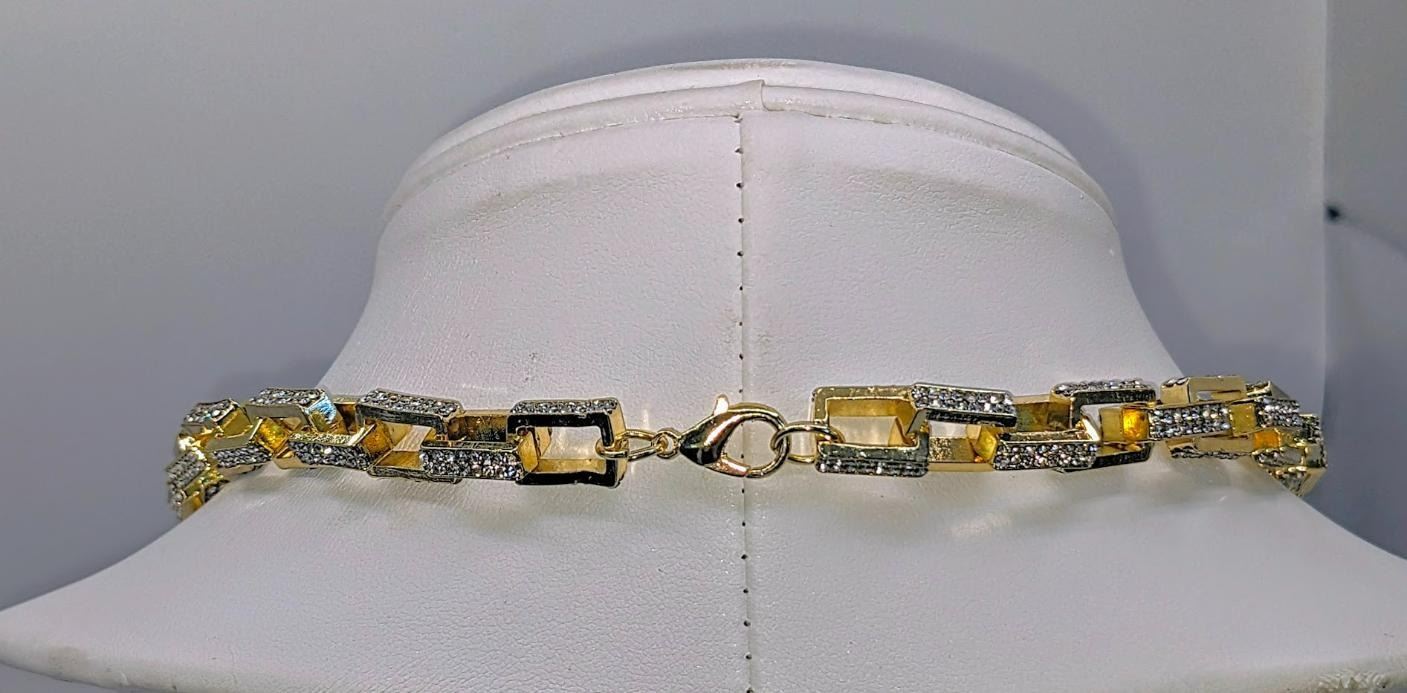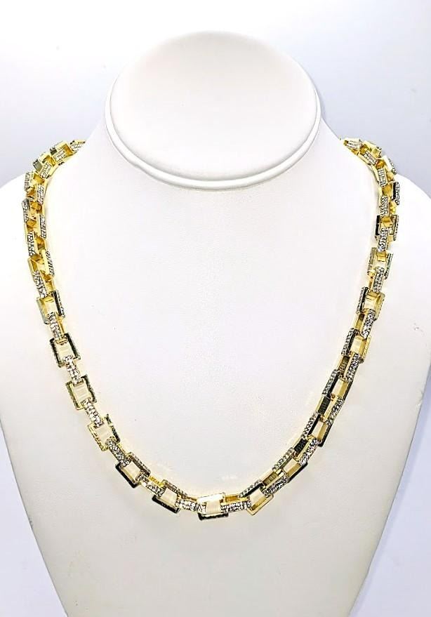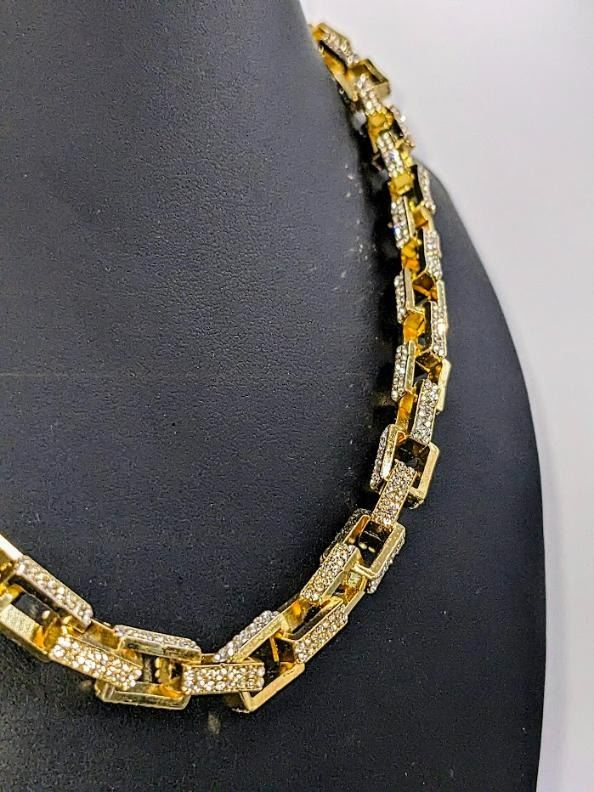 Stunning 14 Kt Yellow Gold Plated Simulated Diamond Necklace. This Large Rolo Box Link Necklace is 22 inches long and a healthy 8.5 mm thick. The total gram Wt. is a healthy 65.4 Grams. This Rolo Link Necklace is always in style.