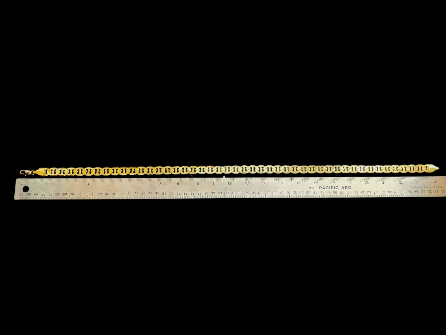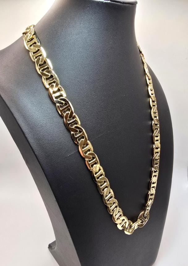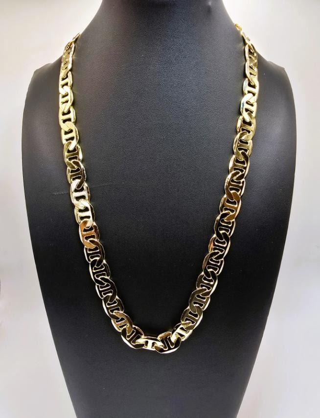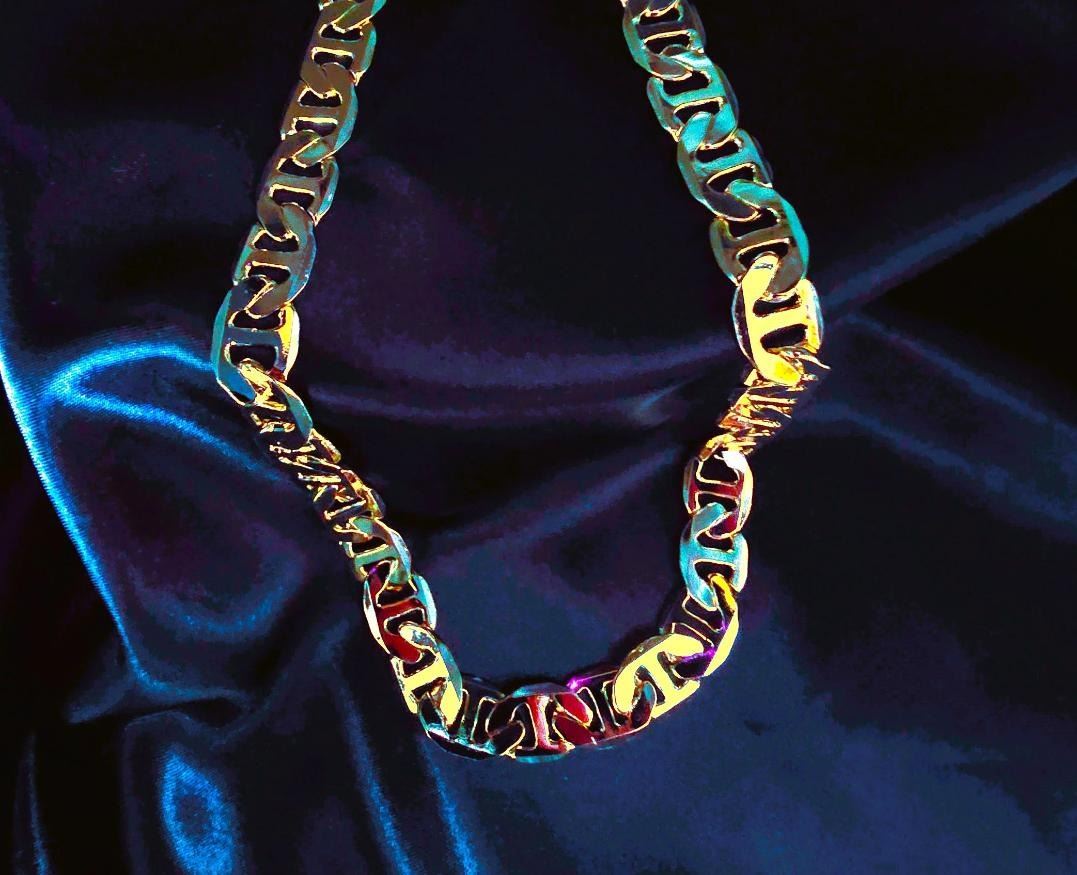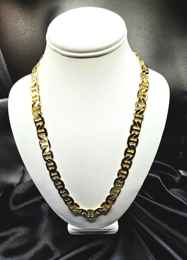 Huge 80 Gram 14K Tri-Layered Yellow Gold Plate Mariners Chain Link Necklace, This 14 K Stamped Mariners Chain Necklace is a fine solid diamond cut. It is 24 inches long and a healthy 12 mm. wide.