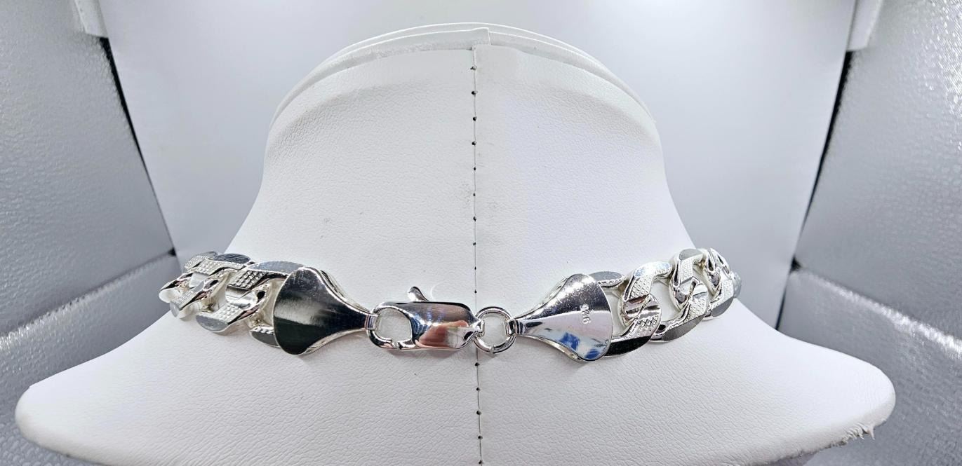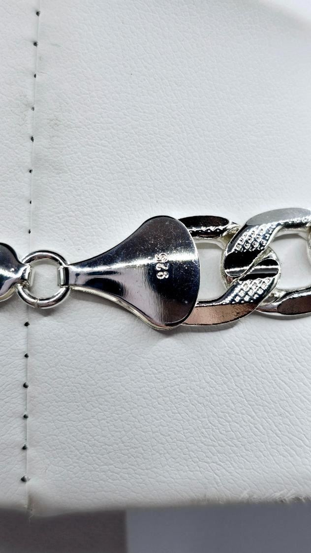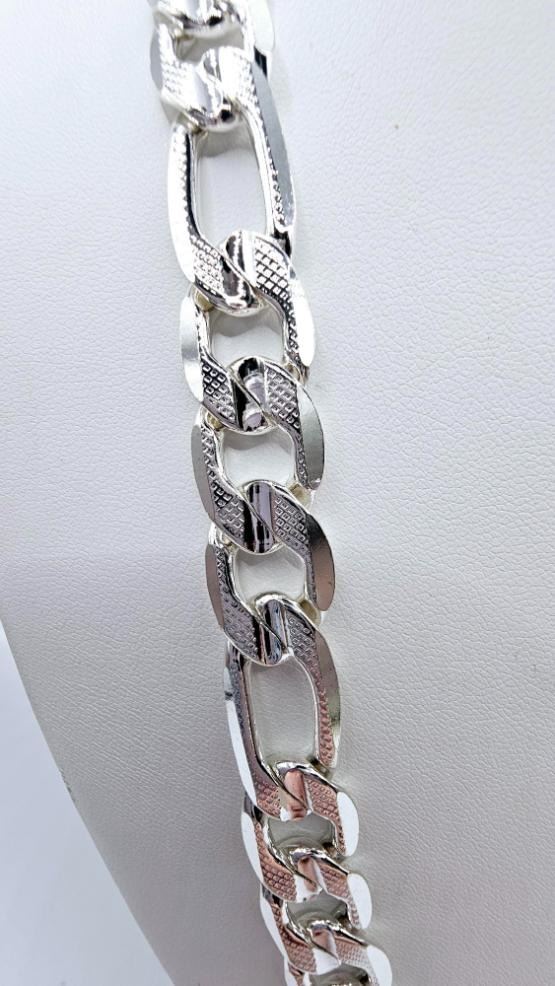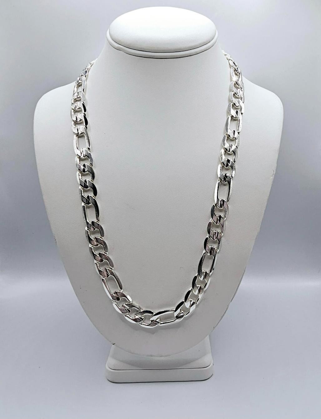 Strong and durable heavy Tri-Layered .925 Sterling Silver Italian Figaro Link Necklace weighing 85.4 Grams. This High Quality Silver Necklace looks and wears just like solid silver and It will not fade. This fine necklace os 24 inches in length and a stealth 12 mm. wide.